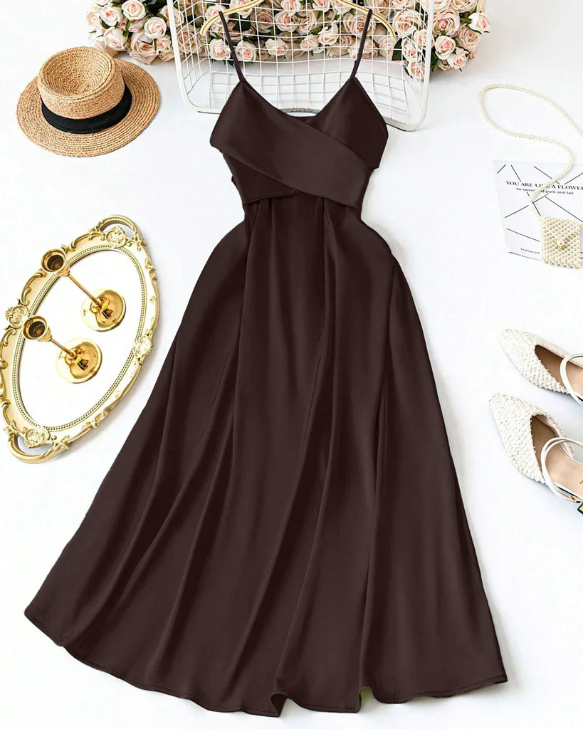 Solid Color Satin Spaghetti Strap Bowknot Elegant Dress Curve & Plus in Coffee