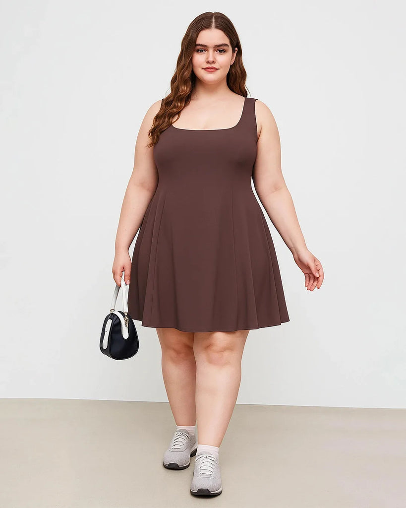 Square Neck Solid Pleated Cami Brown Mini Dress Curve & Plus
