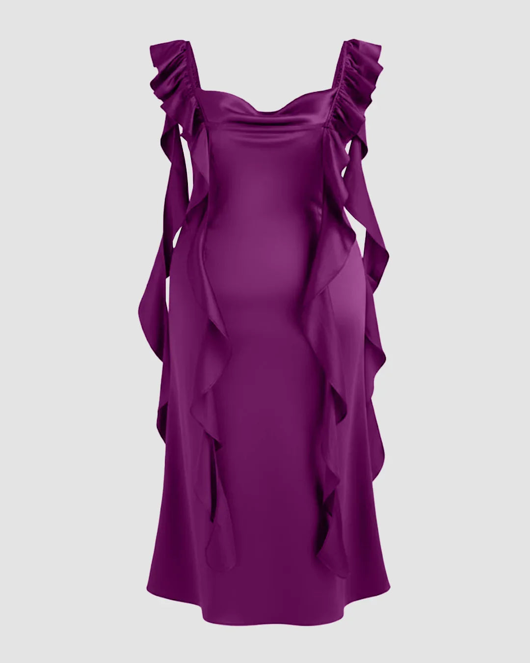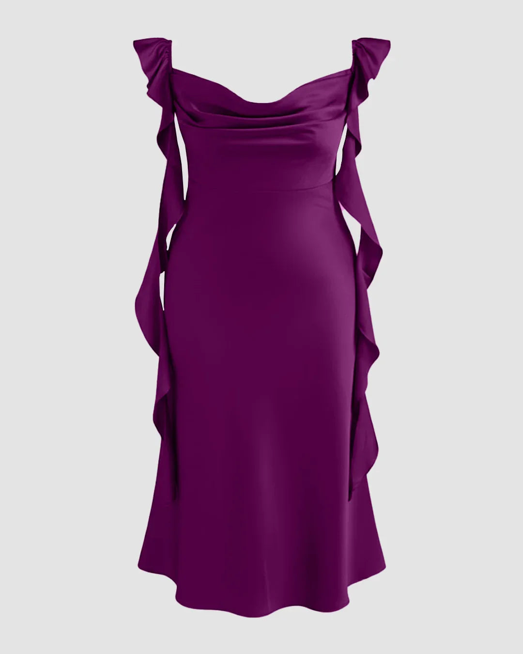 Satin Cowl Neck Solid Ruffle Hem Maxi Dress Curve and Plus in Wine