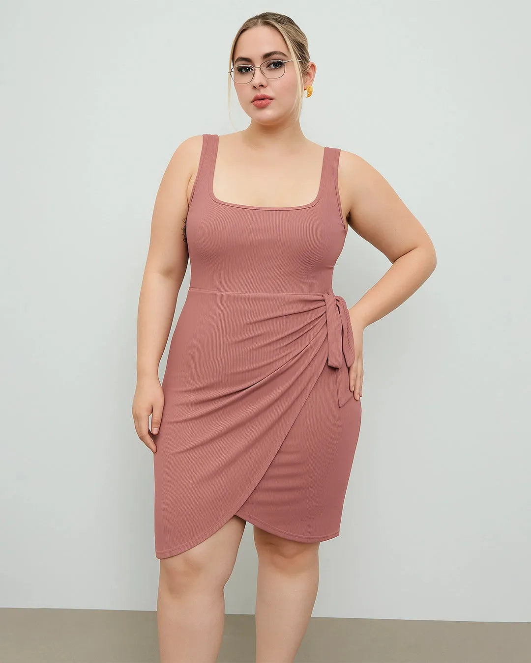 Looking for a dress that’s both cute and comfy? The U-neckline Knotted Ruched Sleeveless Pink Mini Dress Curve & Plus is just what you need! The front knot and ruching add a trendy touch, while the U-neckline gives it a modern and flattering look.
