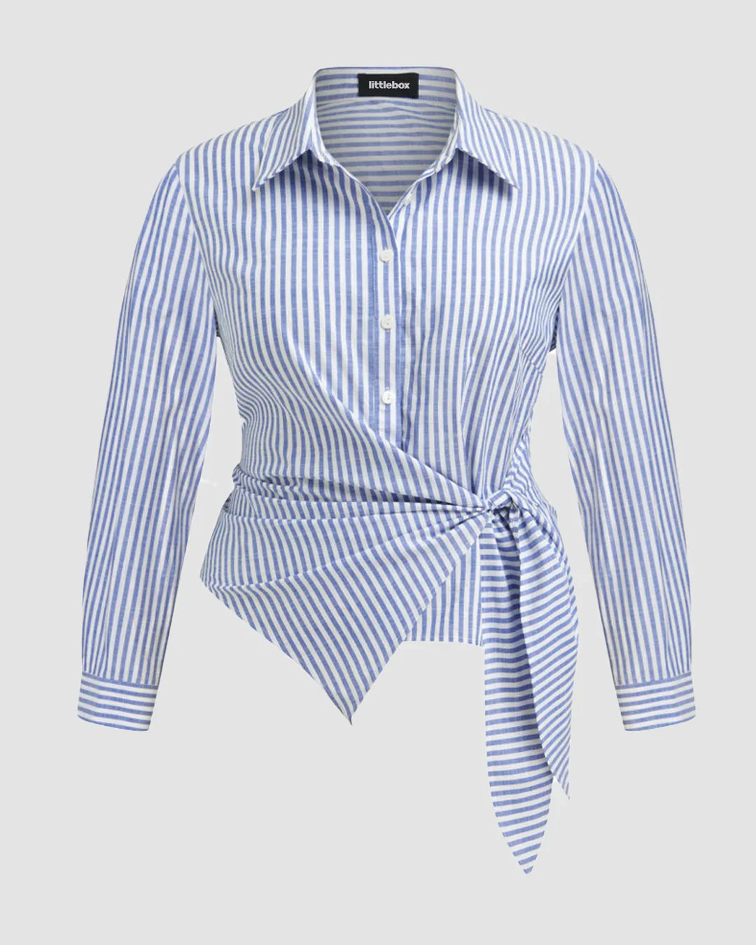 Collar Stripe Knotted Long Sleeve Top Curve & Plus is designed to bring easy polish with a flattering fit. The vertical stripes create a clean, elongating look, while the wrap-style knot detail defines the waist in the most comfortable way. Crafted in smooth polyester, this top feels lightweight on the skin and holds its shape through the day. The collared neckline and button-front detail add a structured touch, balanced by the soft drape of the fabric. It is stylish without trying too hard and works perfectly for everyday wear.