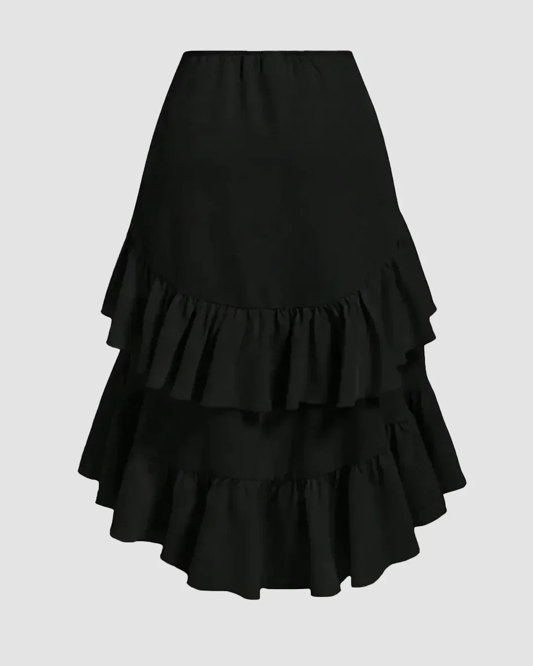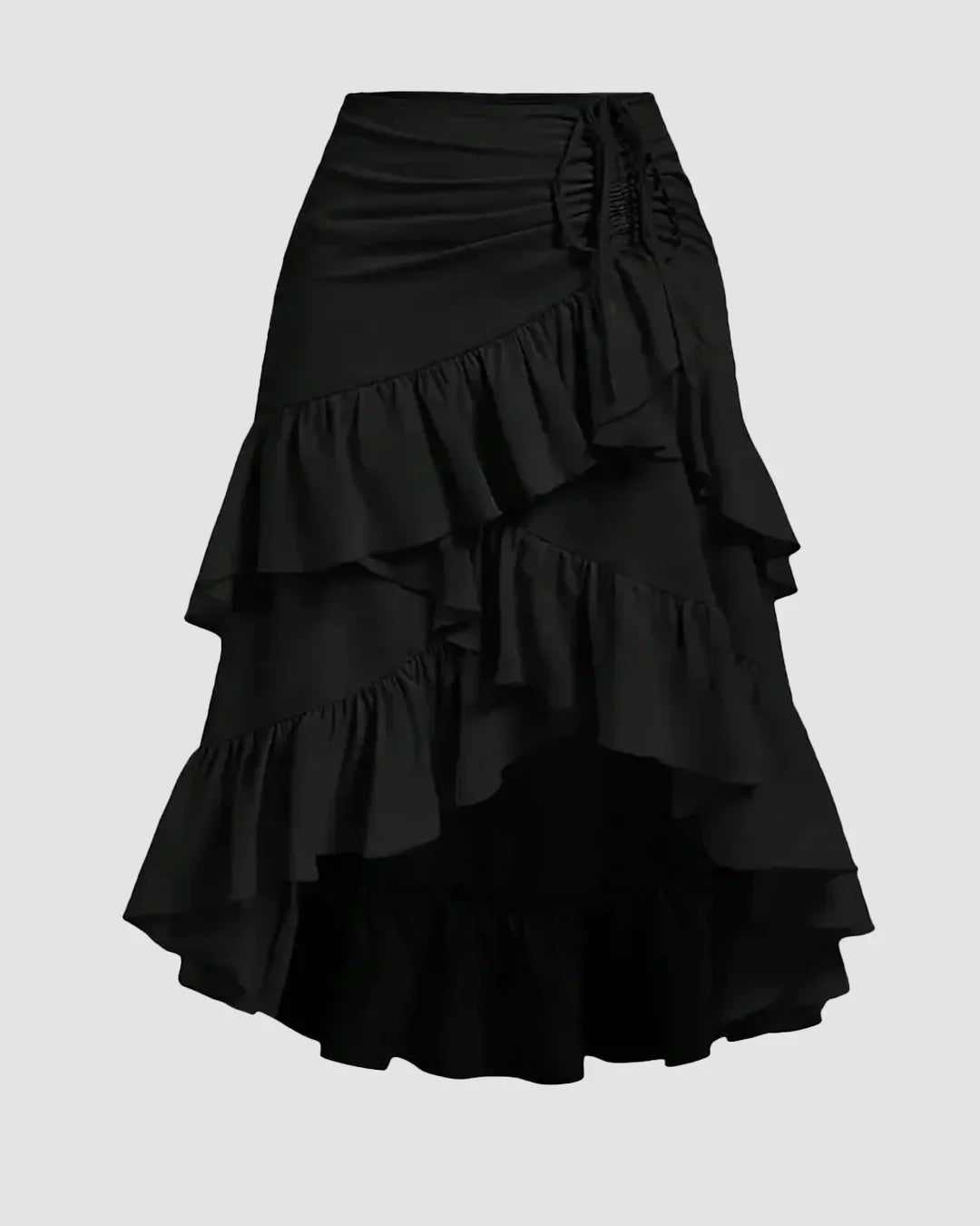 This skirt is designed to bring movement, flow, and statement style together in one easy piece. The high-low hem creates a dramatic silhouette, while the layered ruffles add volume and soft texture with every step. A side drawstring detail allows for an adjustable fit and adds a subtle gathered effect that flatters the waist. Crafted in lightweight fabric, it feels airy and comfortable while still holding its shape beautifully.