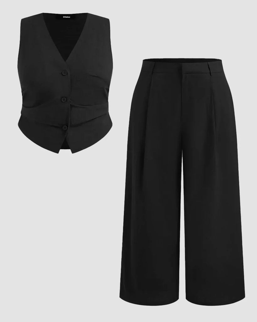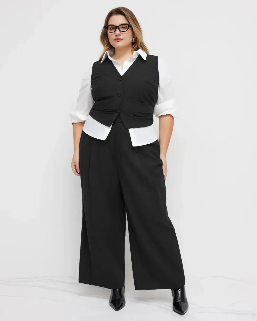 Black Sleeveless Button Vest & Wide-Leg Trousers Set Curve & Plus