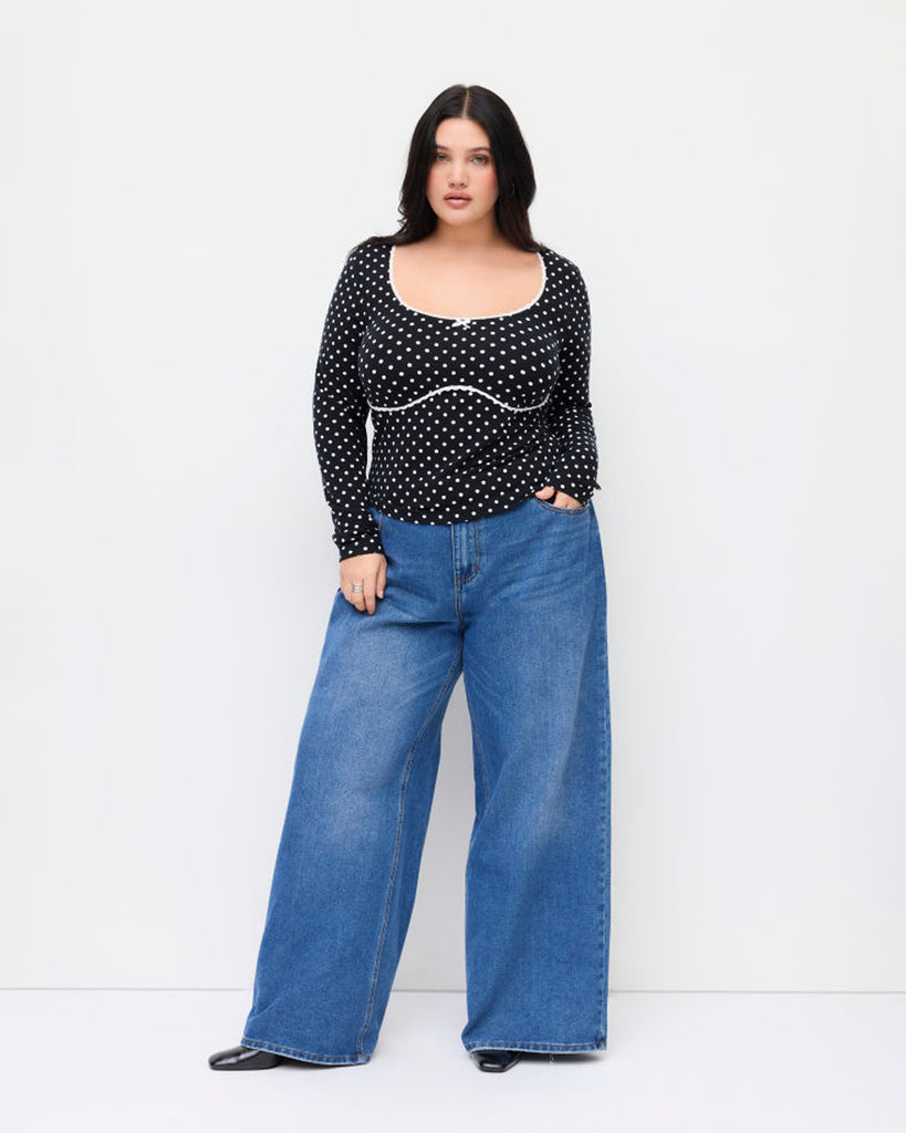 Polka Dotted Bowknot Lace Trim Full Sleeve Top Curve & Plus