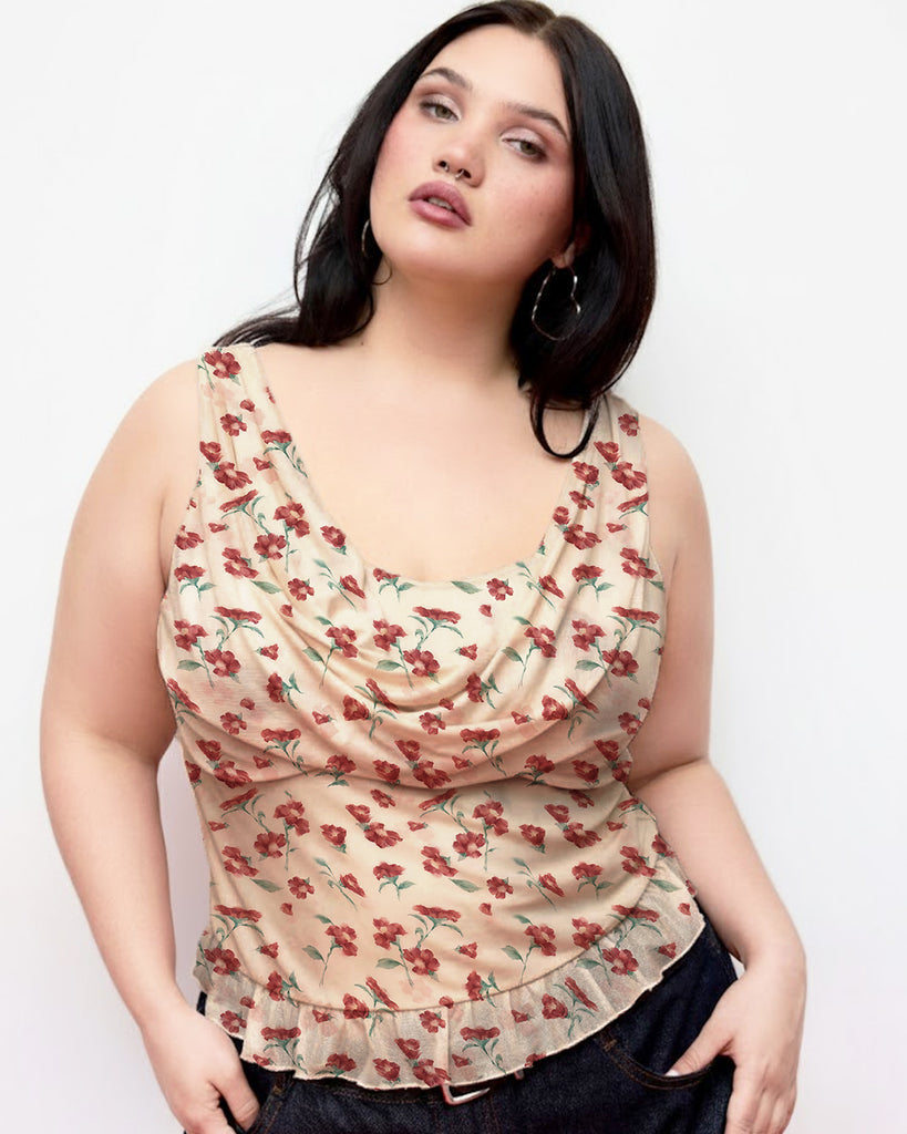 Rose Cowl Neck Back Tie Ruffled Hem Floral Top Curve & Plus