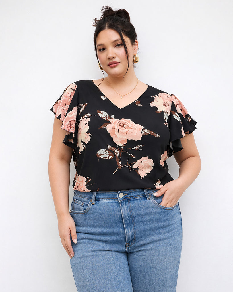 Floral Print Ruffle Sleeve V Neck Top Curve & Plus