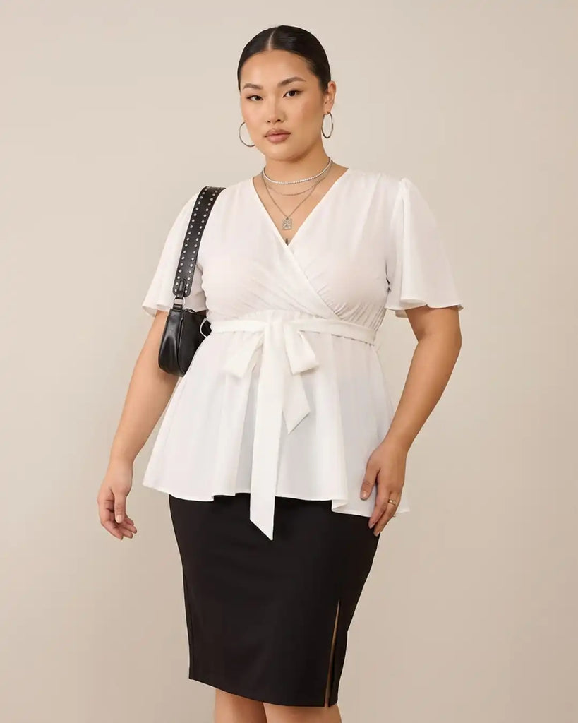 Wrap Style Peplum Front Tie V Neck Top Curve & Plus