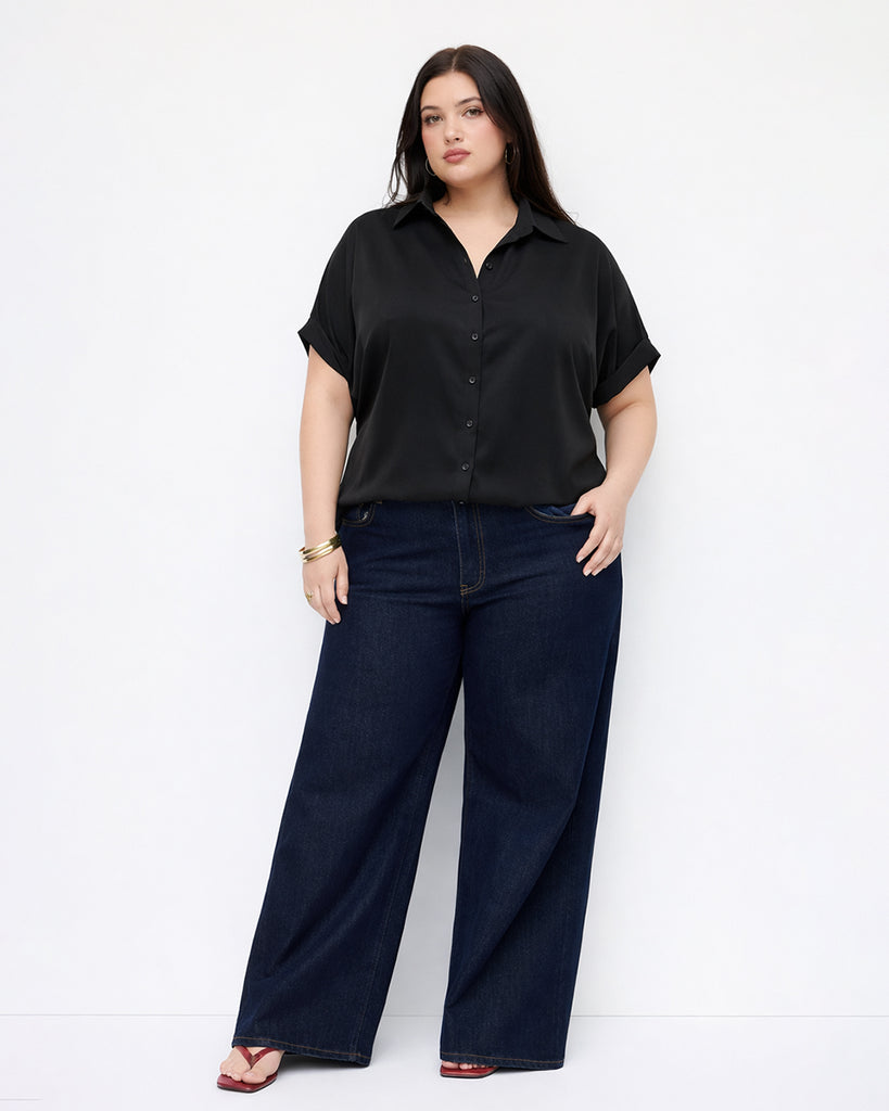 Button Down Short Sleeve Collared Loose Fit Top Curve & Plus in Black