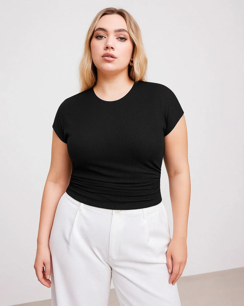 Round Neckline Ruched Solid Short Sleeve Black Top Curve & Plus