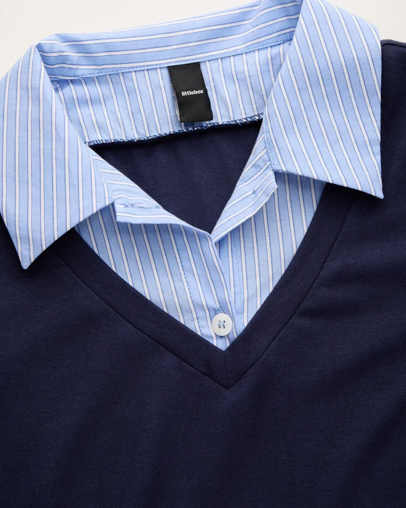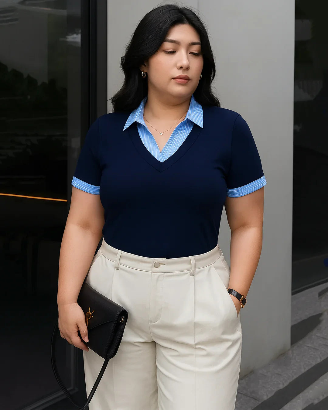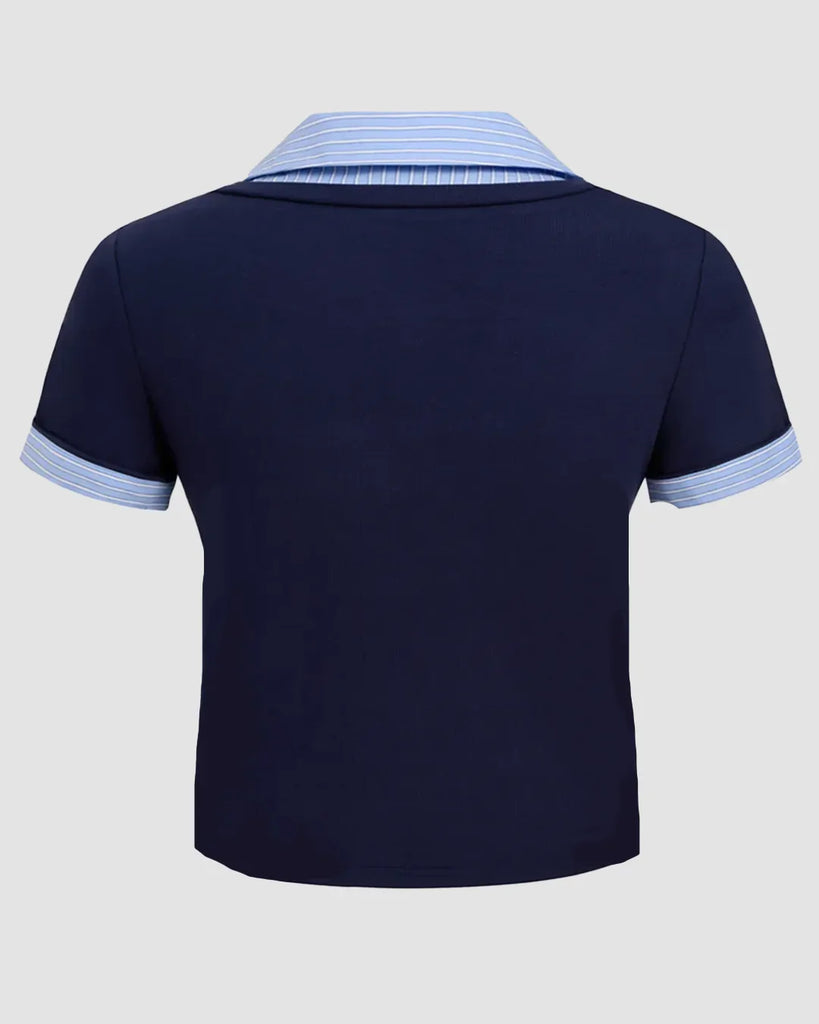 Contrast Collar V Neck Knit Fitted Top in Navy Blue Curve and Plus brings a clean, smart look with its mix of knit fabric and shirt style details. This fitted top stands out with a sharp collared neckline, a V neck cut, and short sleeves with striped contrast cuffs. The navy blue color keeps it simple and polished, while the polyester and cotton blend gives a soft, stretchy feel that works well for women who like an everyday top with a structured touch. The fitted shape and solid pattern make this fitted top great for casual or formal moments.
