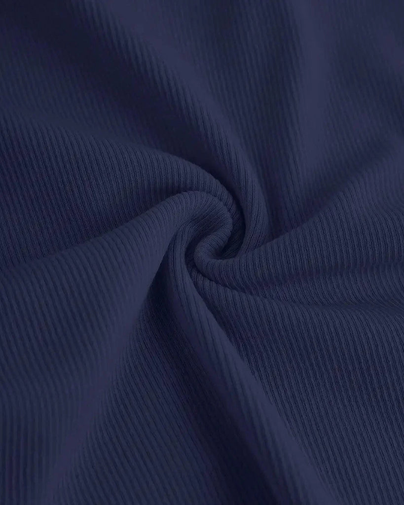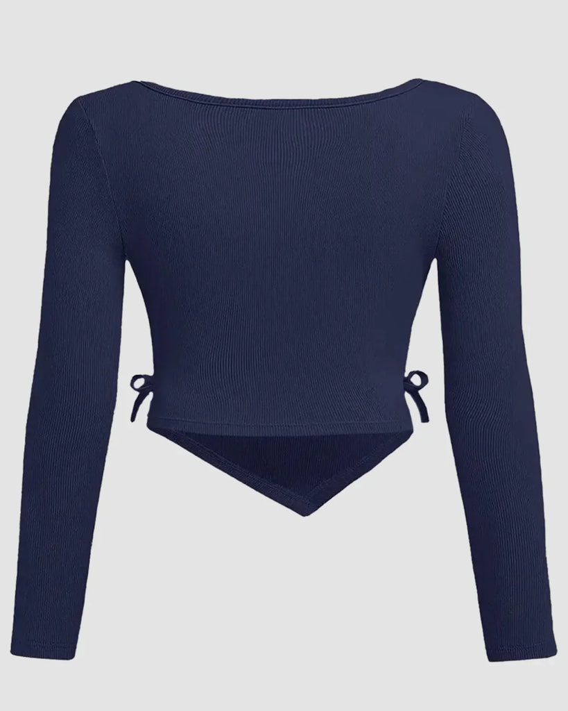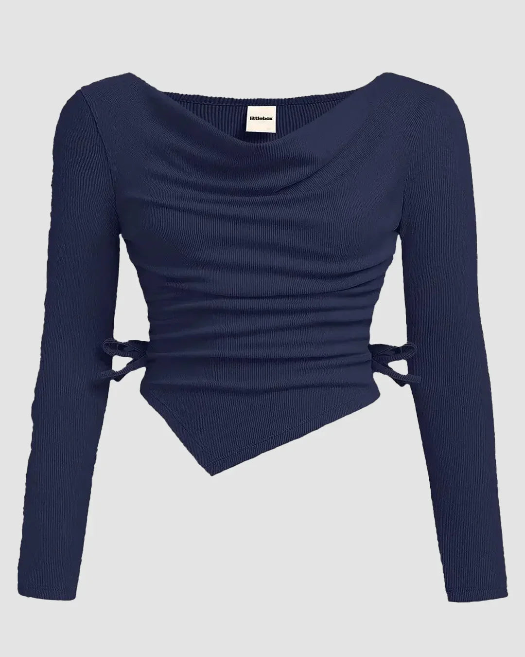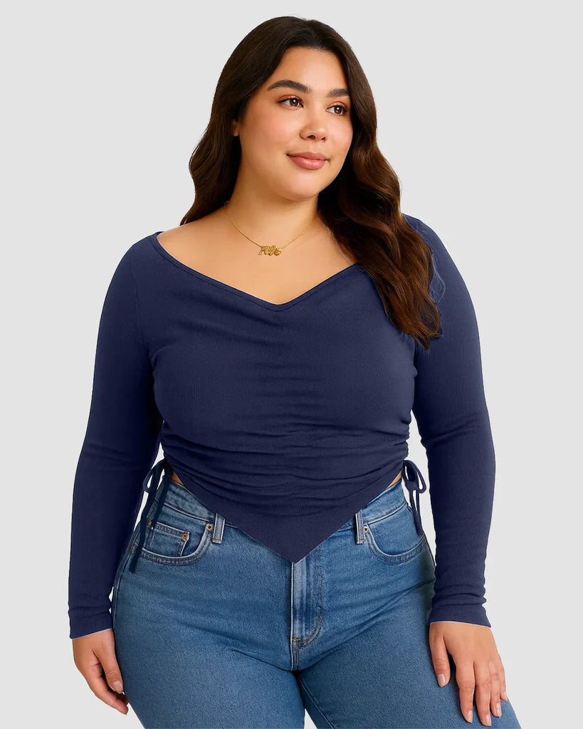 Crew Neck Cinched Waist Asymmetrical Long Sleeve Top In Navy Blue Curve & Plus