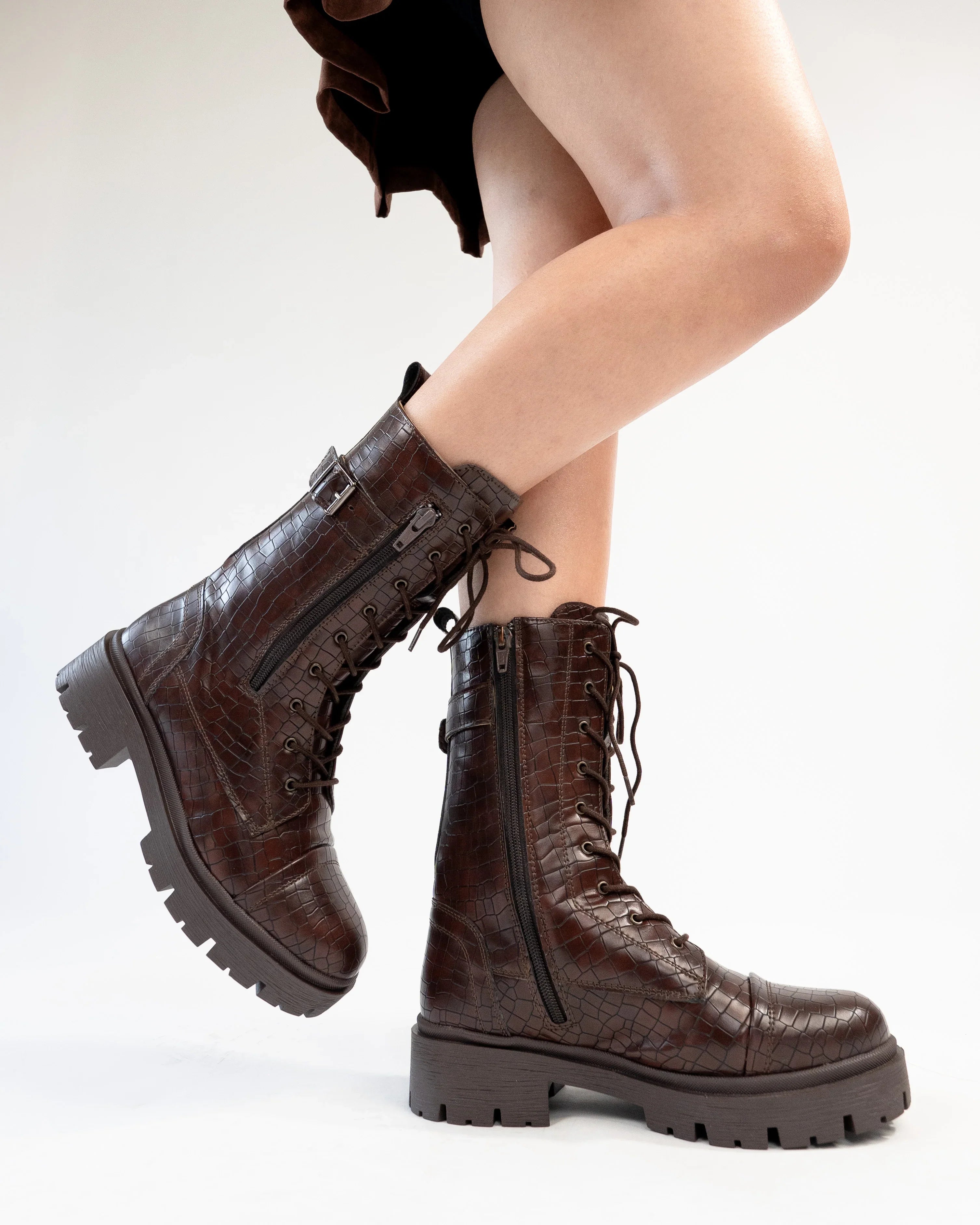 These lace up boots bring a bold, structured edge to your everyday style. Designed in a deep brown croco textured finish, they instantly elevate any outfit with a strong yet polished vibe. The round toe keeps the shape classic, while the lace-up front adds detail and adjustable comfort. Built on a sturdy sole with a supportive fit, these lace up boots balance style and function effortlessly.