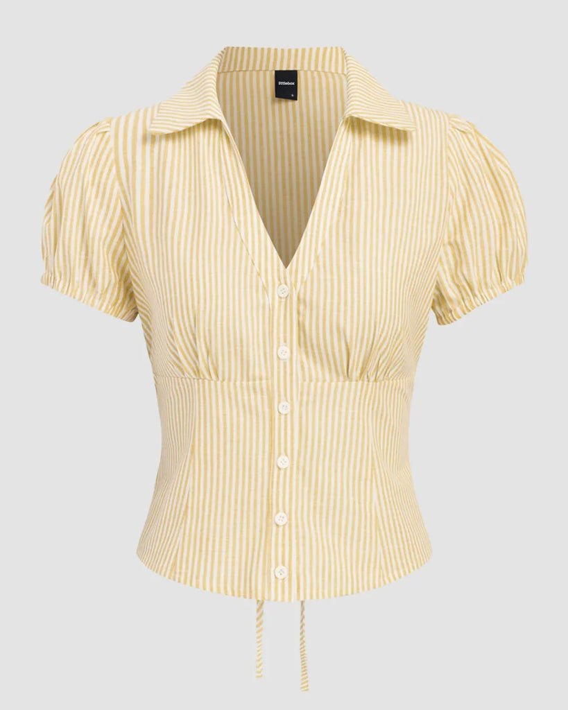 Ruched Button Down Puff Sleeve Top in Yellow Curve & Plus