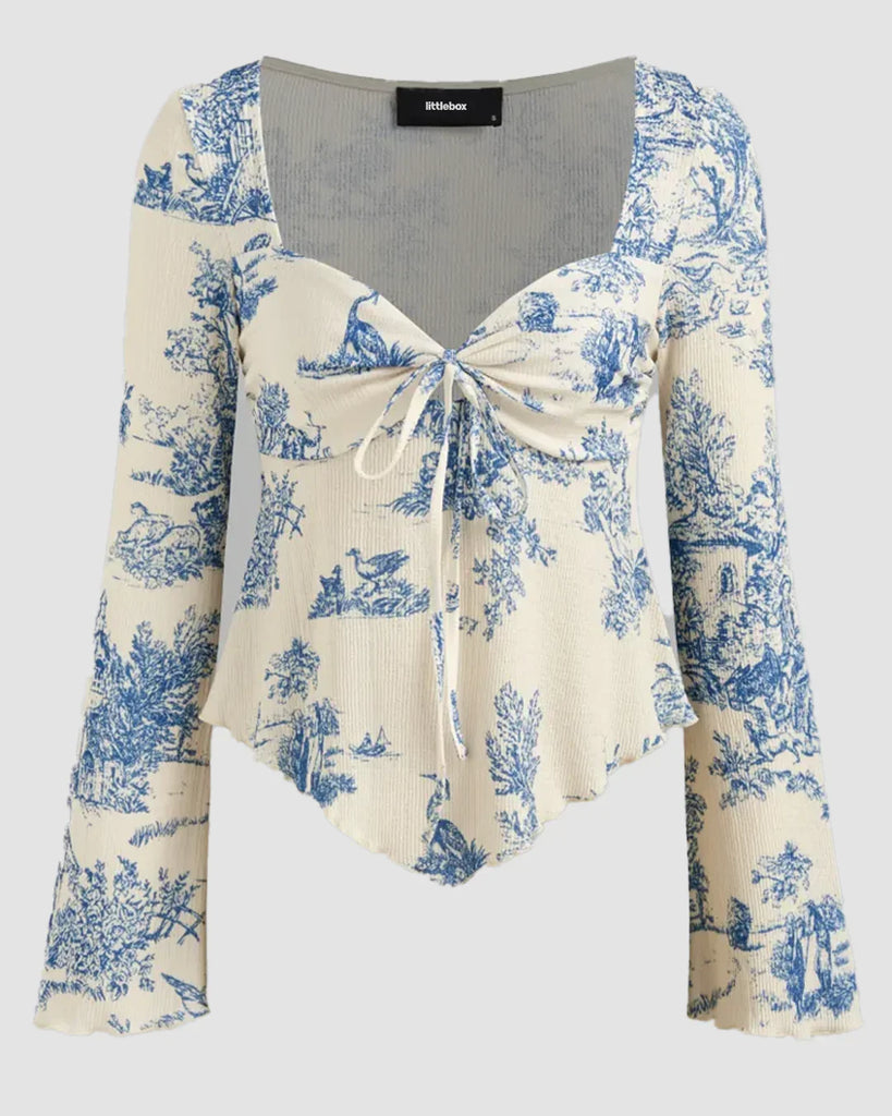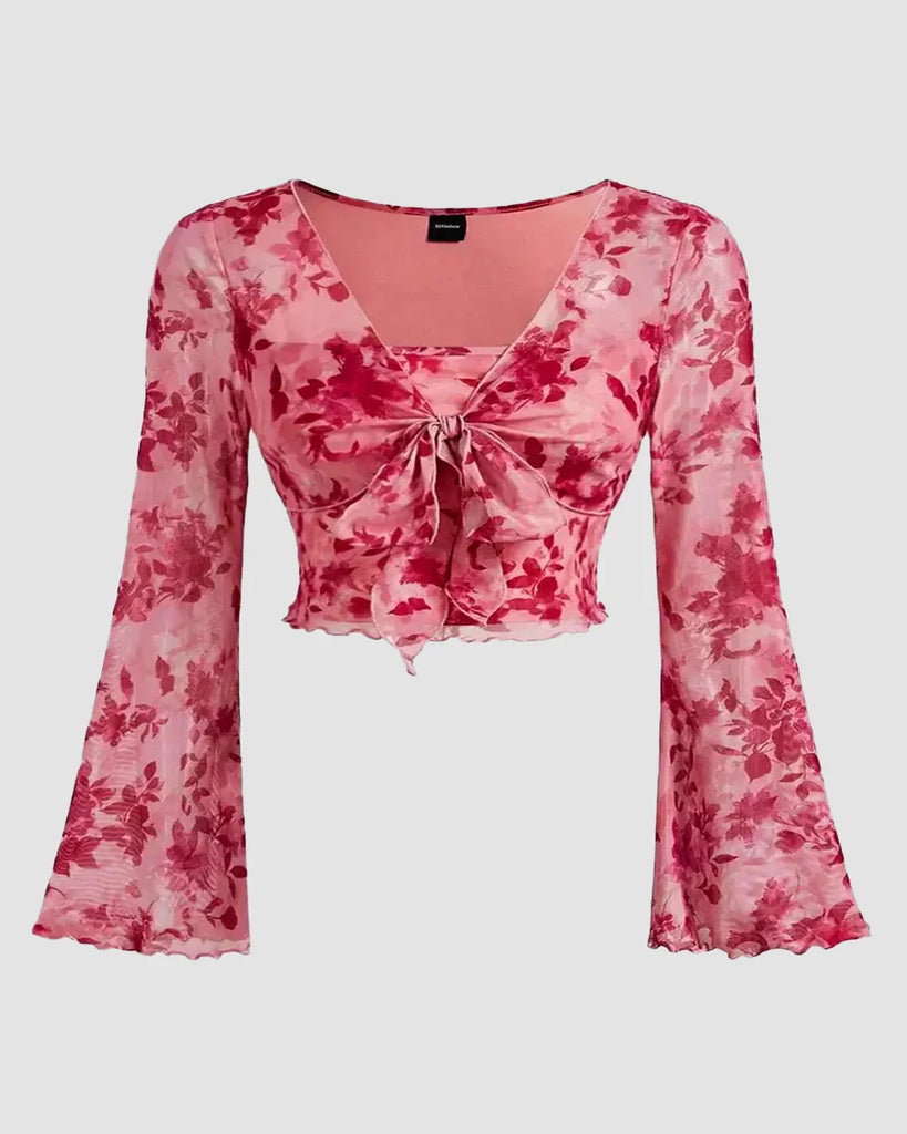 Floral Print Tie Front Bell Sleeve Mesh Crop Top Curve & Plus