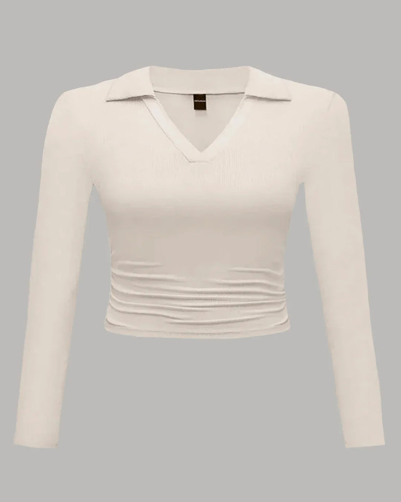 Collared V-Neck Full Sleeve Top in Apricot Curve & Plus