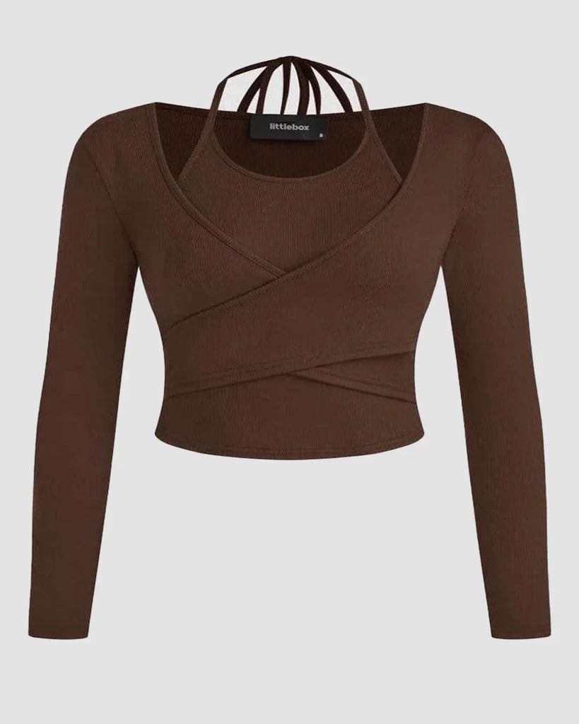 Solid Wrap Cut Out Neck Rib Knit Full Sleeve Top In Chocolate Curve & Plus