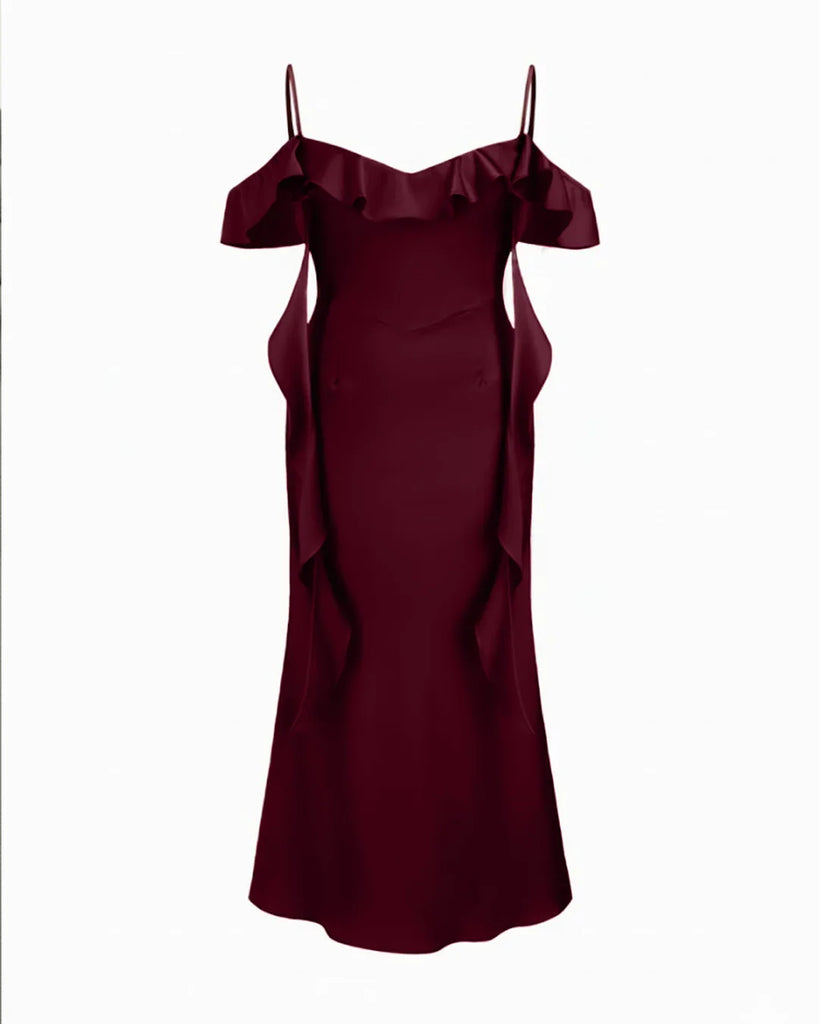 Satin V-neck Backless Ruffle Hem Maxi Dress Curve & Plus in Burgundy