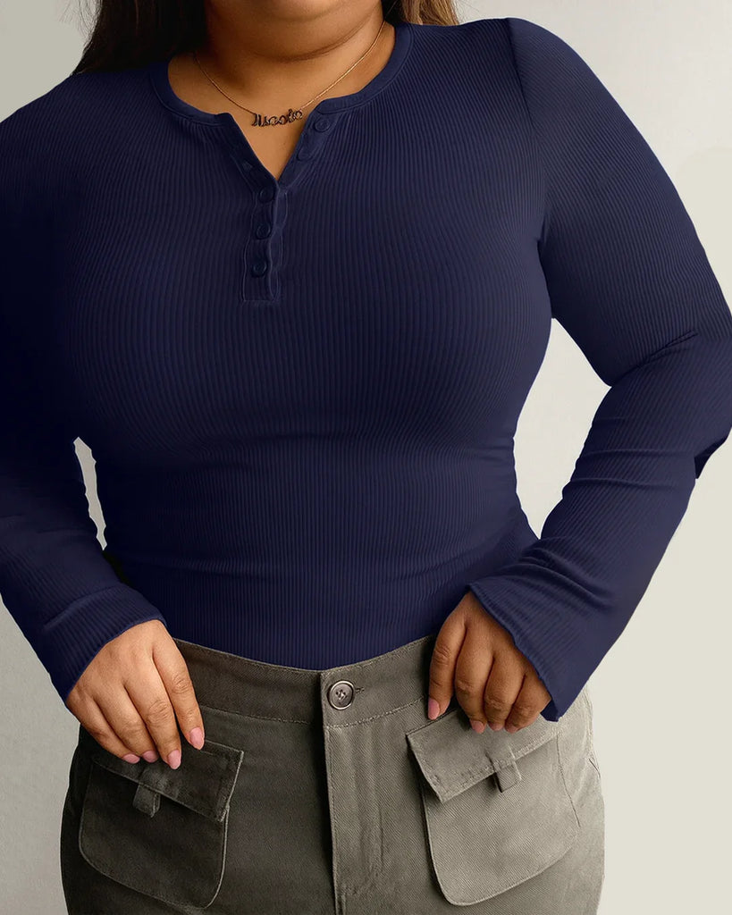 Navy Blue Ribbed Long Sleeve Henley Top Curve & Plus