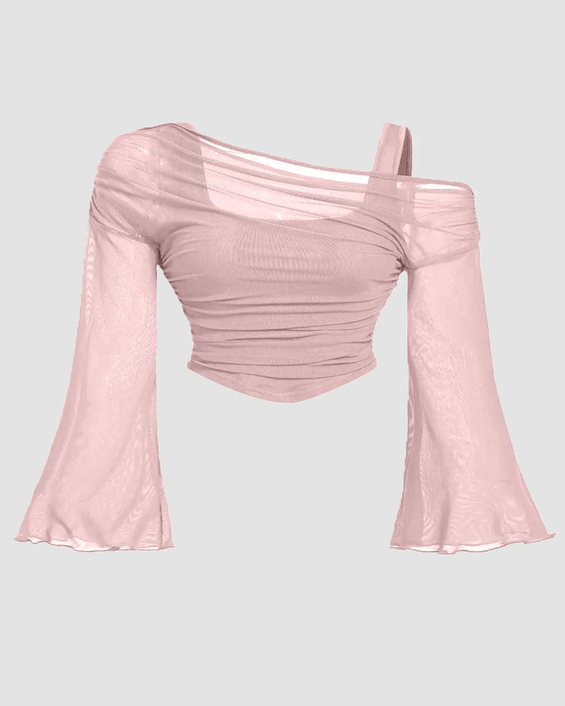 Mesh Off-Shoulder Long Sleeve Light Pink Top Curve & Plus