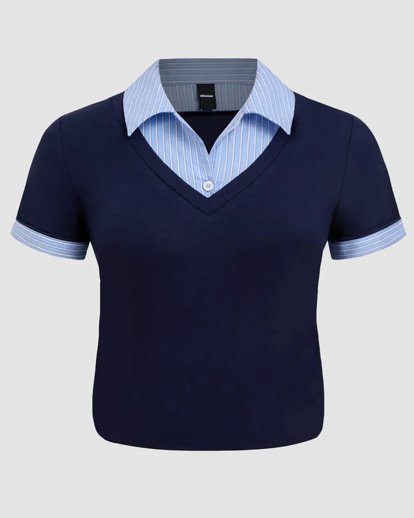 Contrast Collar V-Neck Knit Fitted Top in Navy Blue Curve & Plus