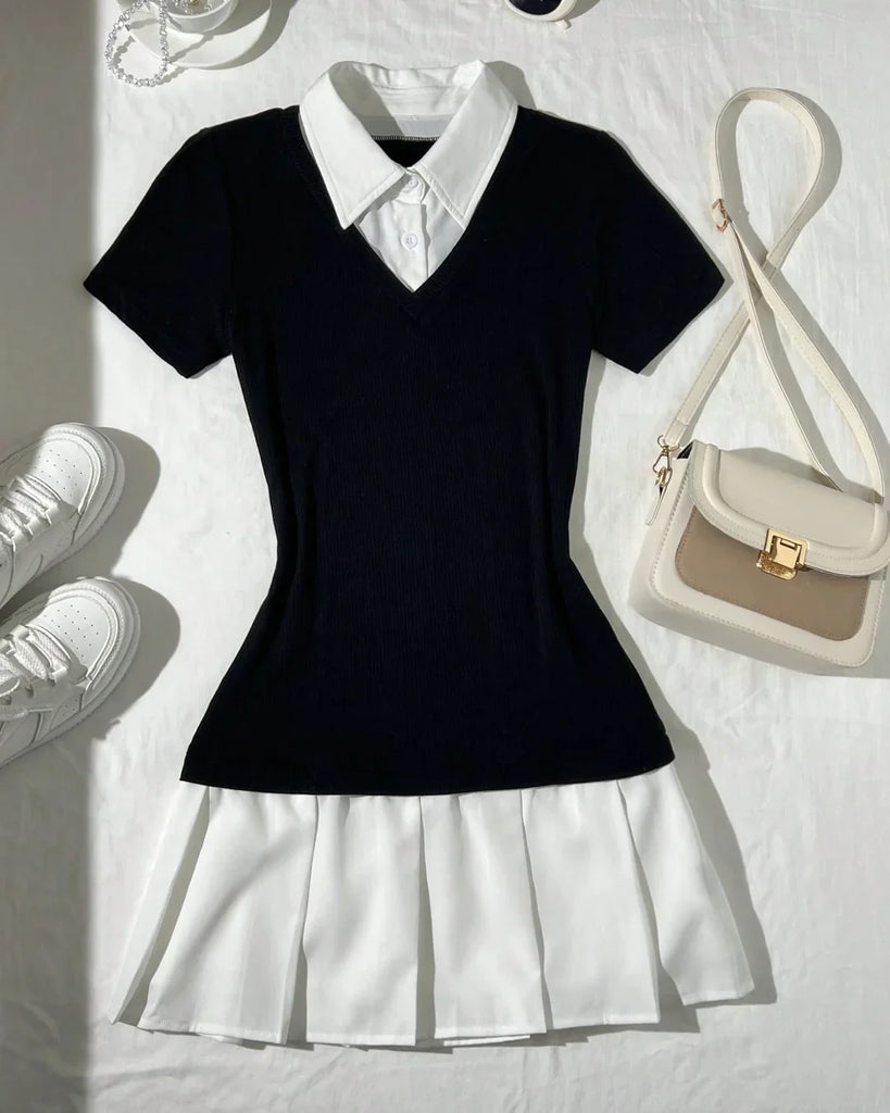 Contrast Collar Pleated Hem Mini Dress in Black Curve & Plus