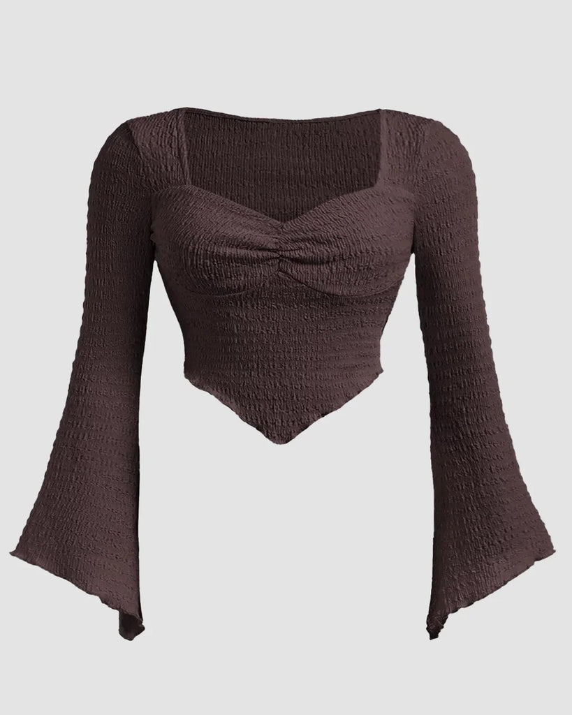 Solid Color Textured Heart Neck Flare Sleeve Casual Long Sleeve Top In Brown Curve & Plus