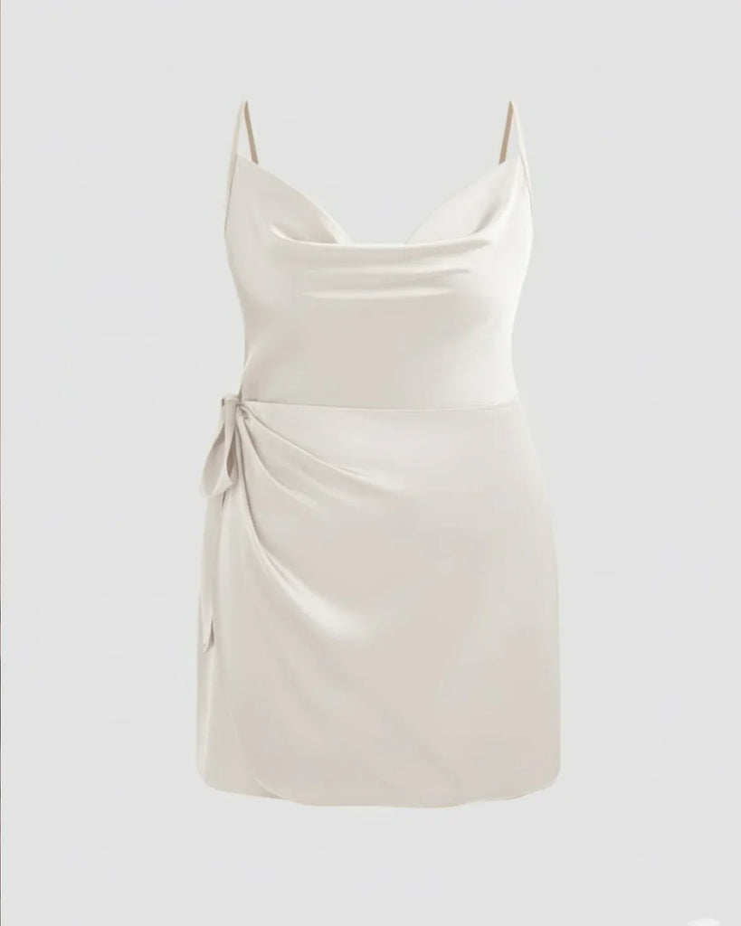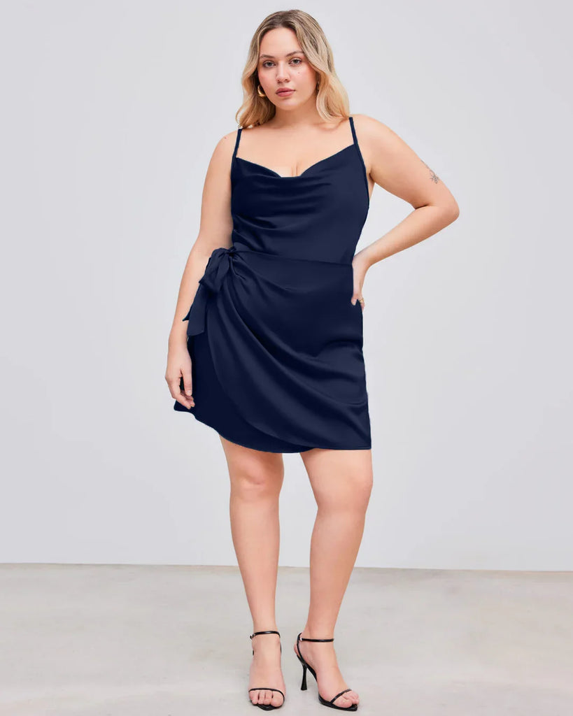 Satin Cowl Neck Solid Knotted Zipper Mini Dress Curve & Plus