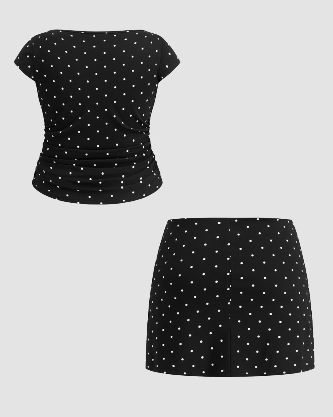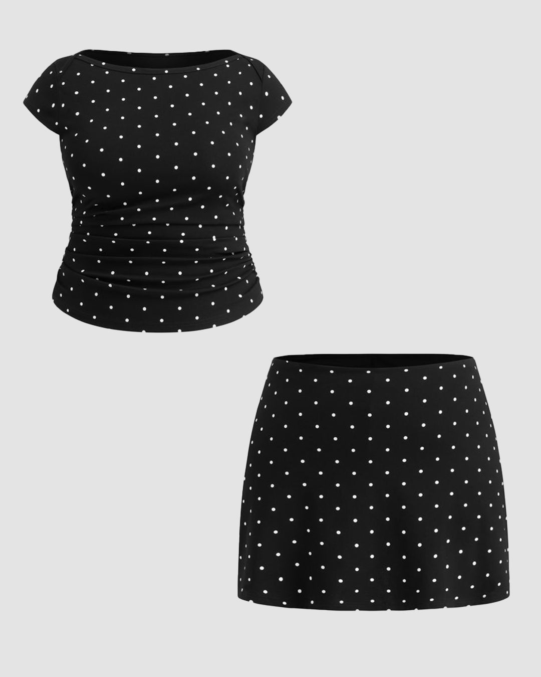 Boat Neck Polka Dot Ruched Top & Mini Skirt Set Curve & Plus