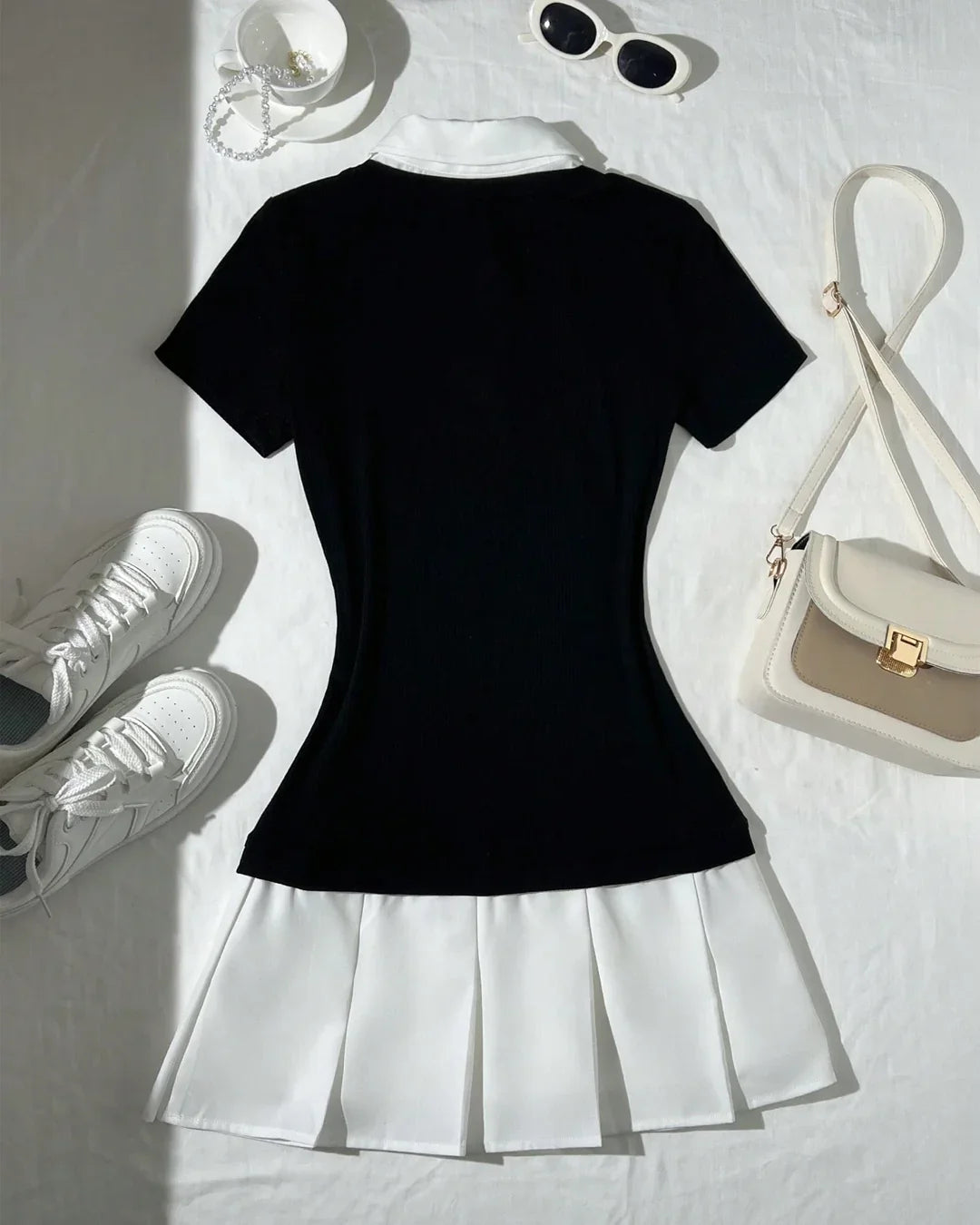 Contrast Collar Pleated Hem Mini Dress in Black Curve & Plus
