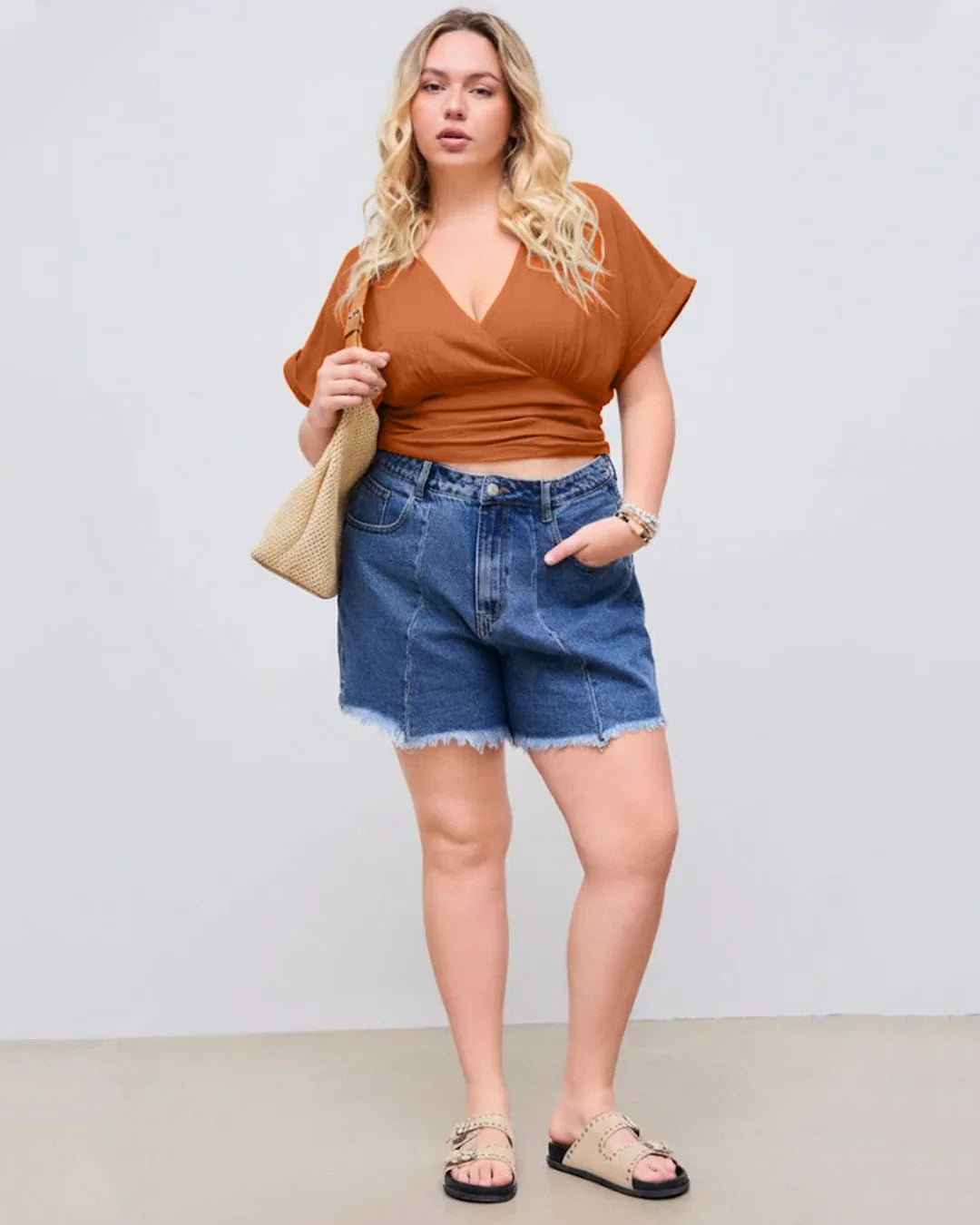 Linen Blend V neck Wrap Knotted Roll up Sleeve Crop Top Curve and Plus brings an easy, relaxed fit with a soft textured feel that makes everyday styling simple. This Roll up Sleeve Crop Top features a wrap style front, a flattering V neckline, and short sleeves that fold up for a casual, effortless vibe. The knotted detail adds shape at the waist, while the lightweight linen blend keeps the top breathable and comfortable for long wear. The overall look is minimal, chic, and easy to pair with denim, trousers, or skirts.