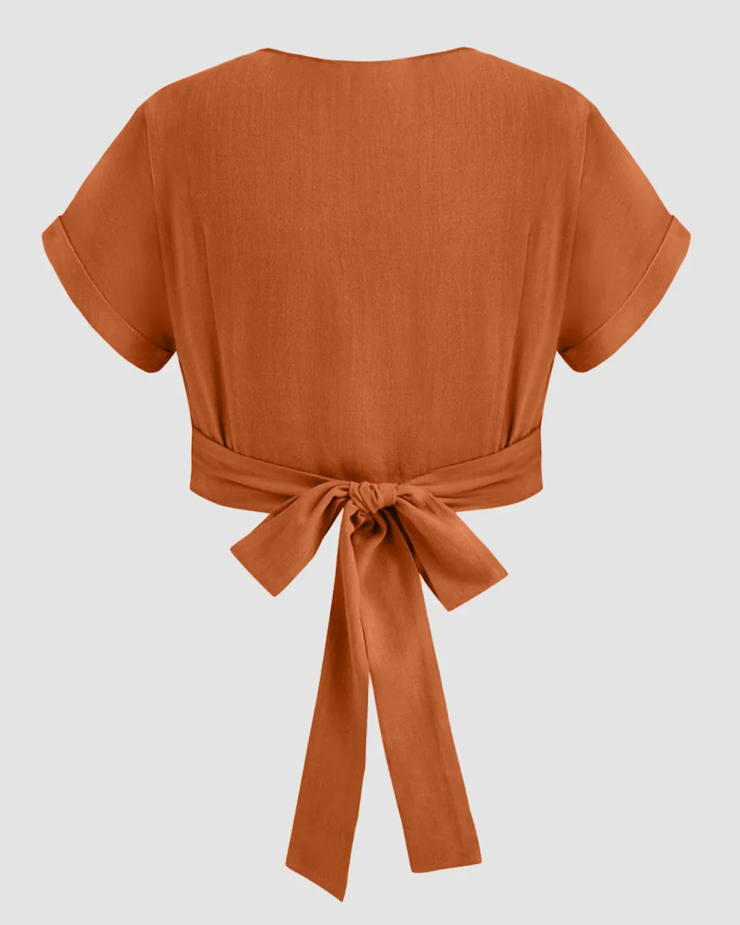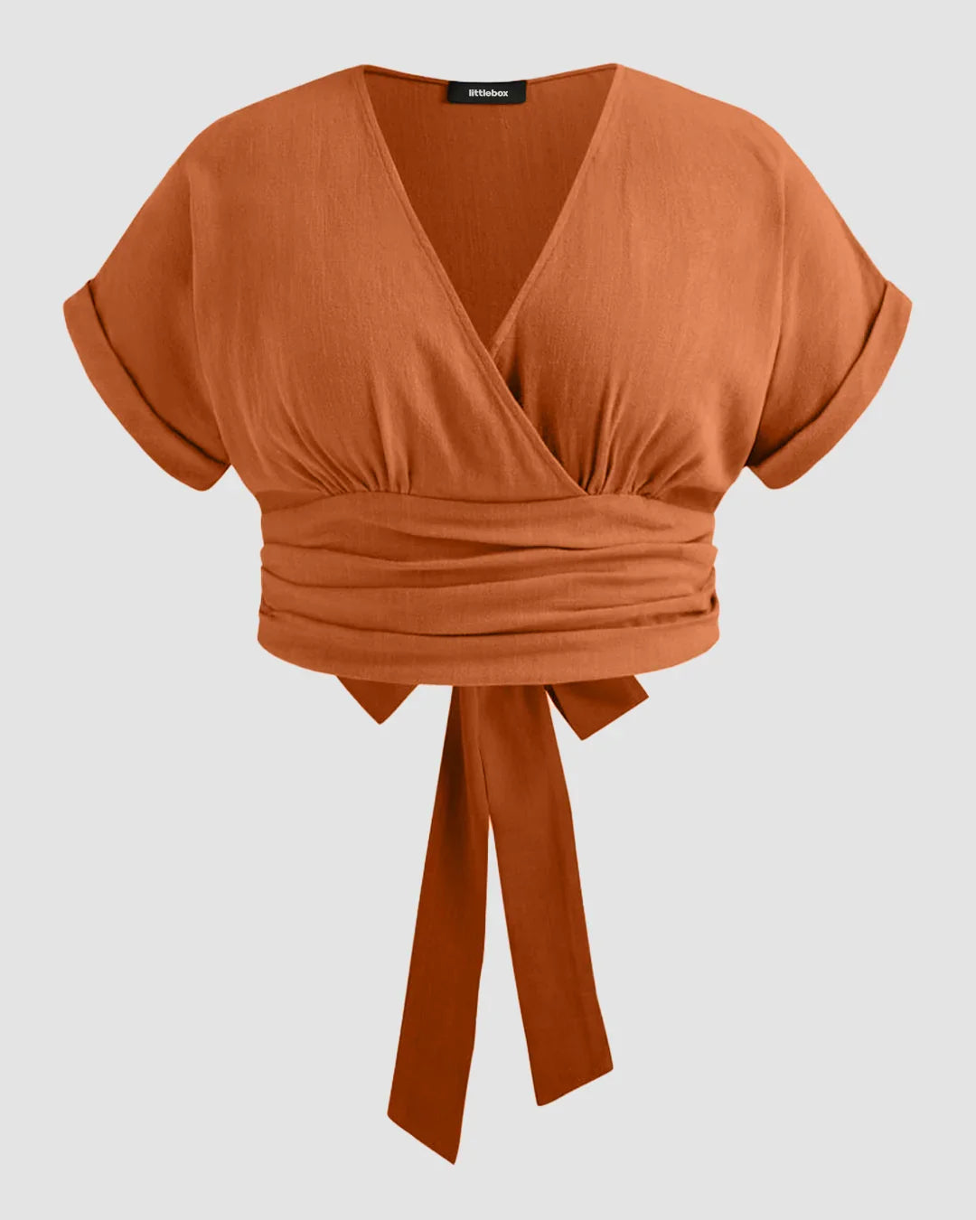 Linen-Blend V-neck Wrap Knotted Roll-up Sleeve Crop Top Curve & Plus in Rust