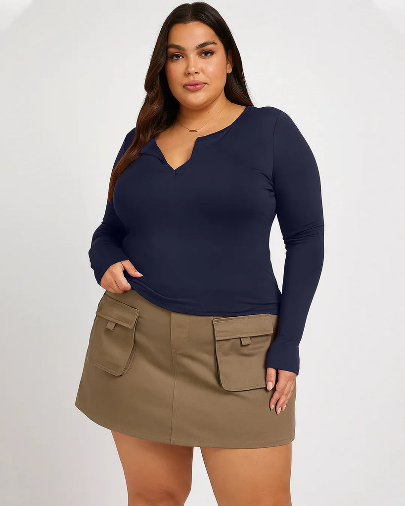 Navy Blue Ribbed Long Sleeve Henley Top Curve & Plus
