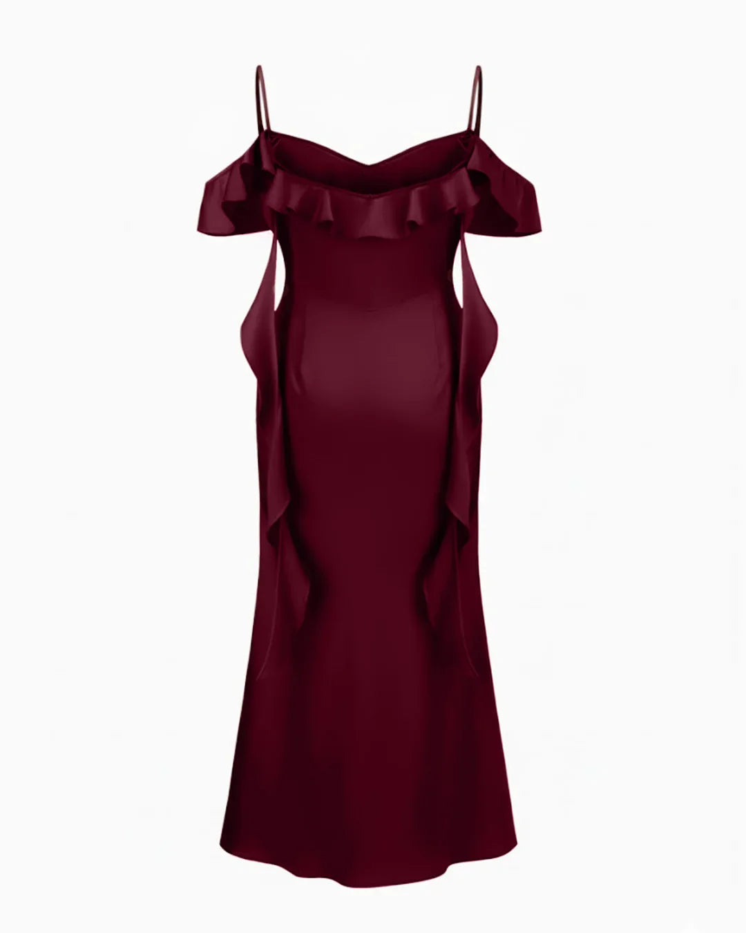 Satin V-neck Backless Ruffle Hem Maxi Dress Curve & Plus in Burgundy