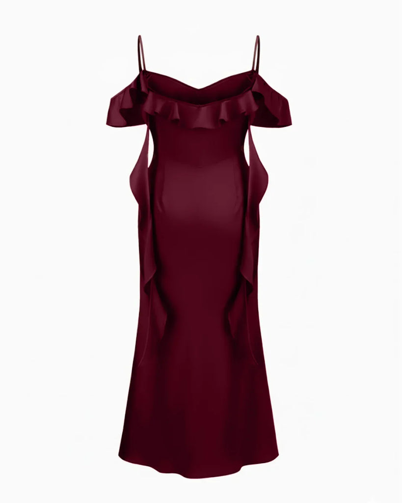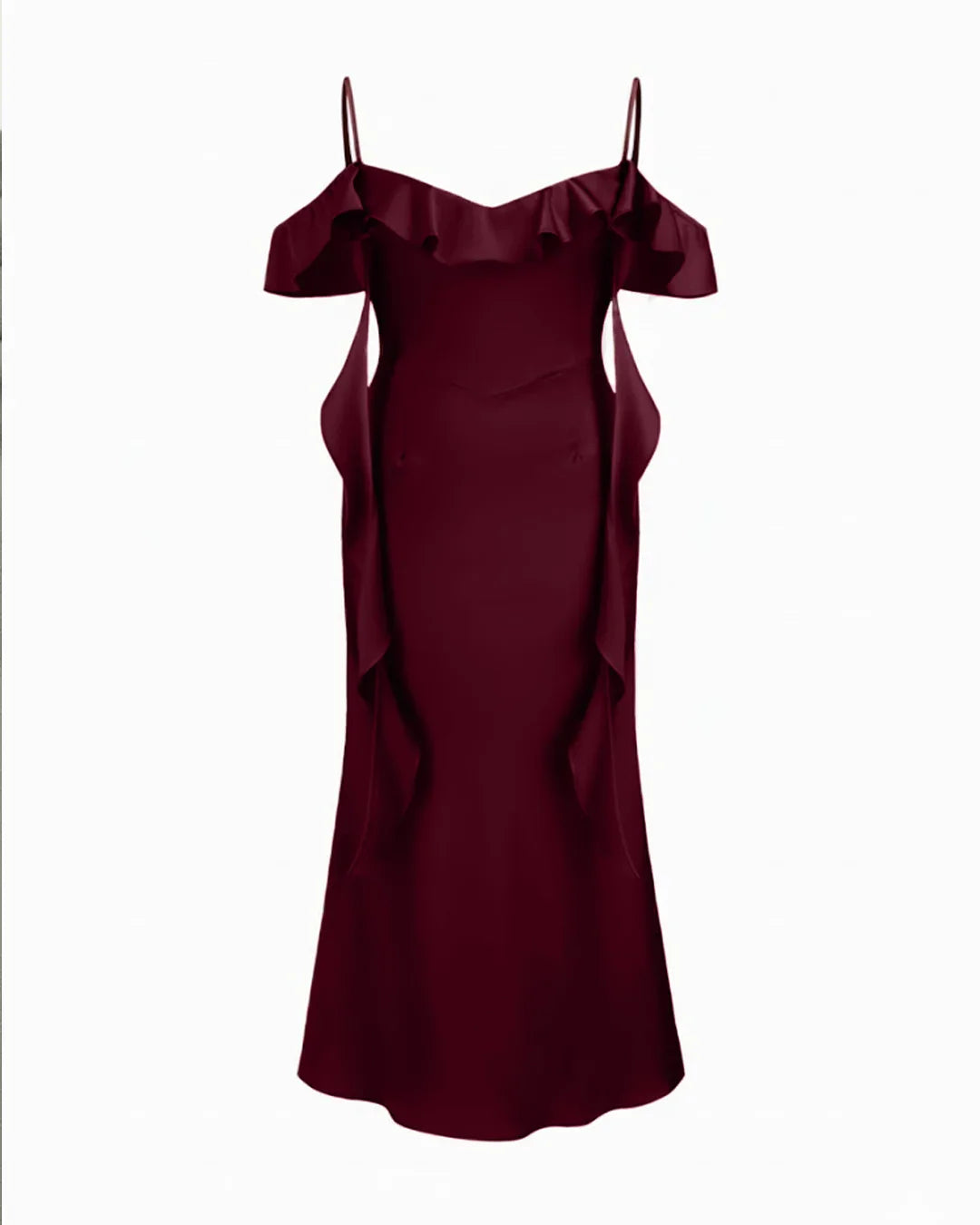 This maxi dress curve & plus edition is built to stand out with its soft satin shine and fluid drape. The deep V-neck adds a clean, flattering shape, while the backless cut gives the dress an elegant twist. The ruffle detailing brings gentle movement, making the silhouette feel romantic and flowy. Made with a smooth blend of polyester, viscose, and twill, it feels lightweight yet structured. The rich burgundy tone gives this maxi dress curve & plus piece a bold and refined mood that works for day or night.