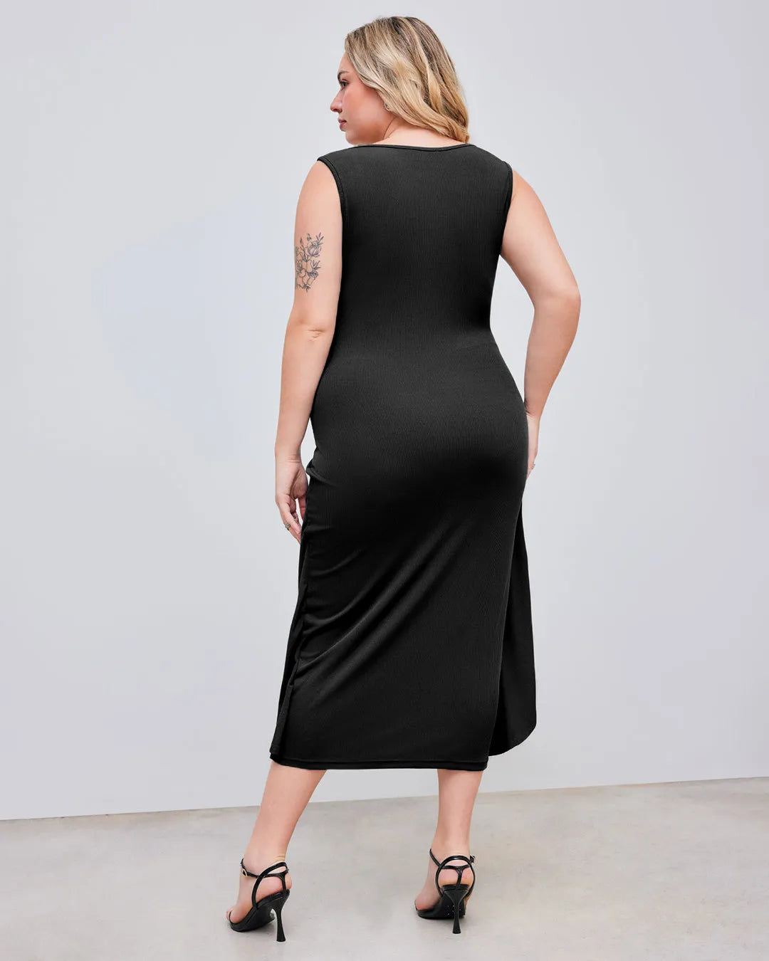 Black ribbed midi dress for curve and plus sizes, featuring front buttons and a drawstring waist for a flattering, adjustable fit.