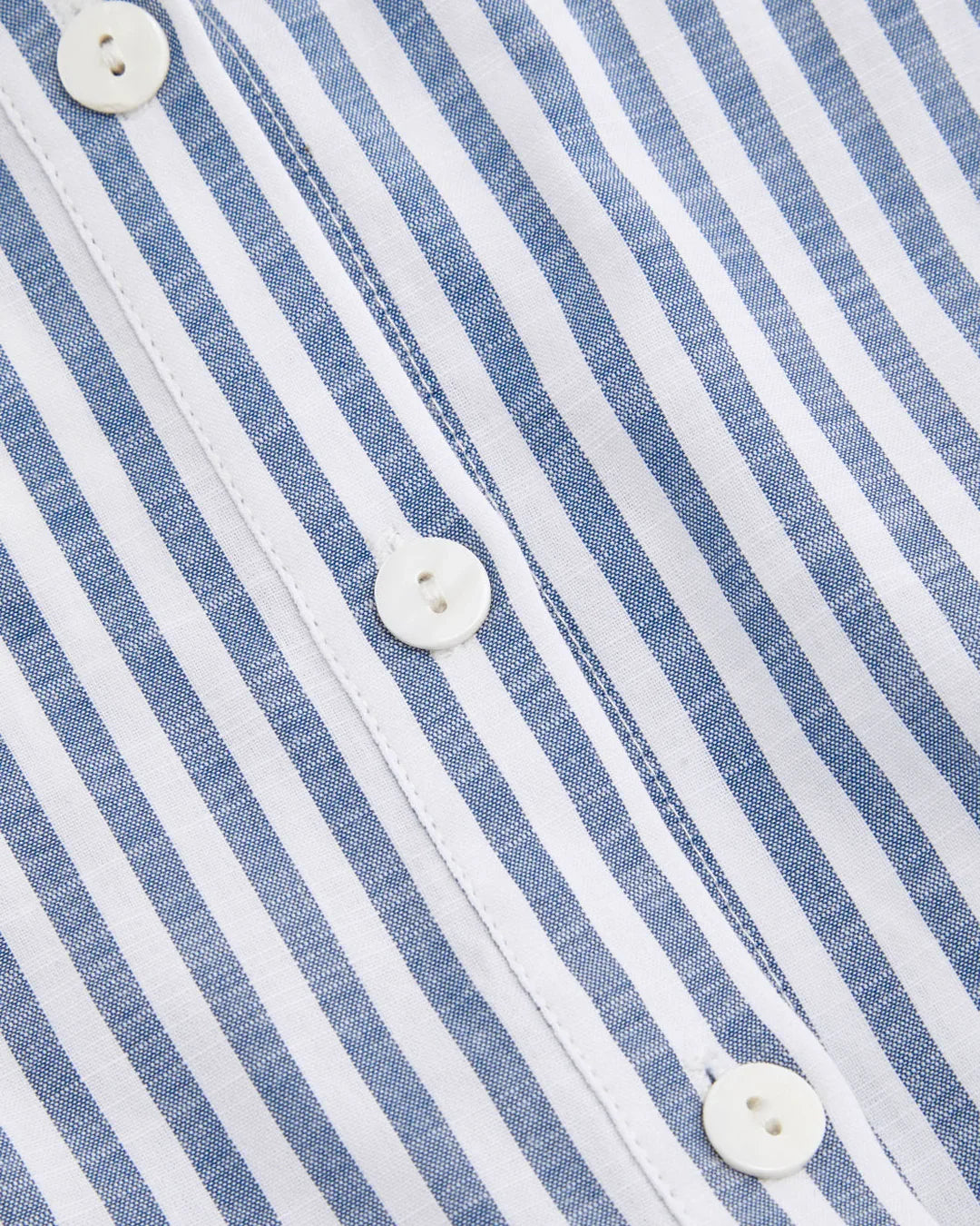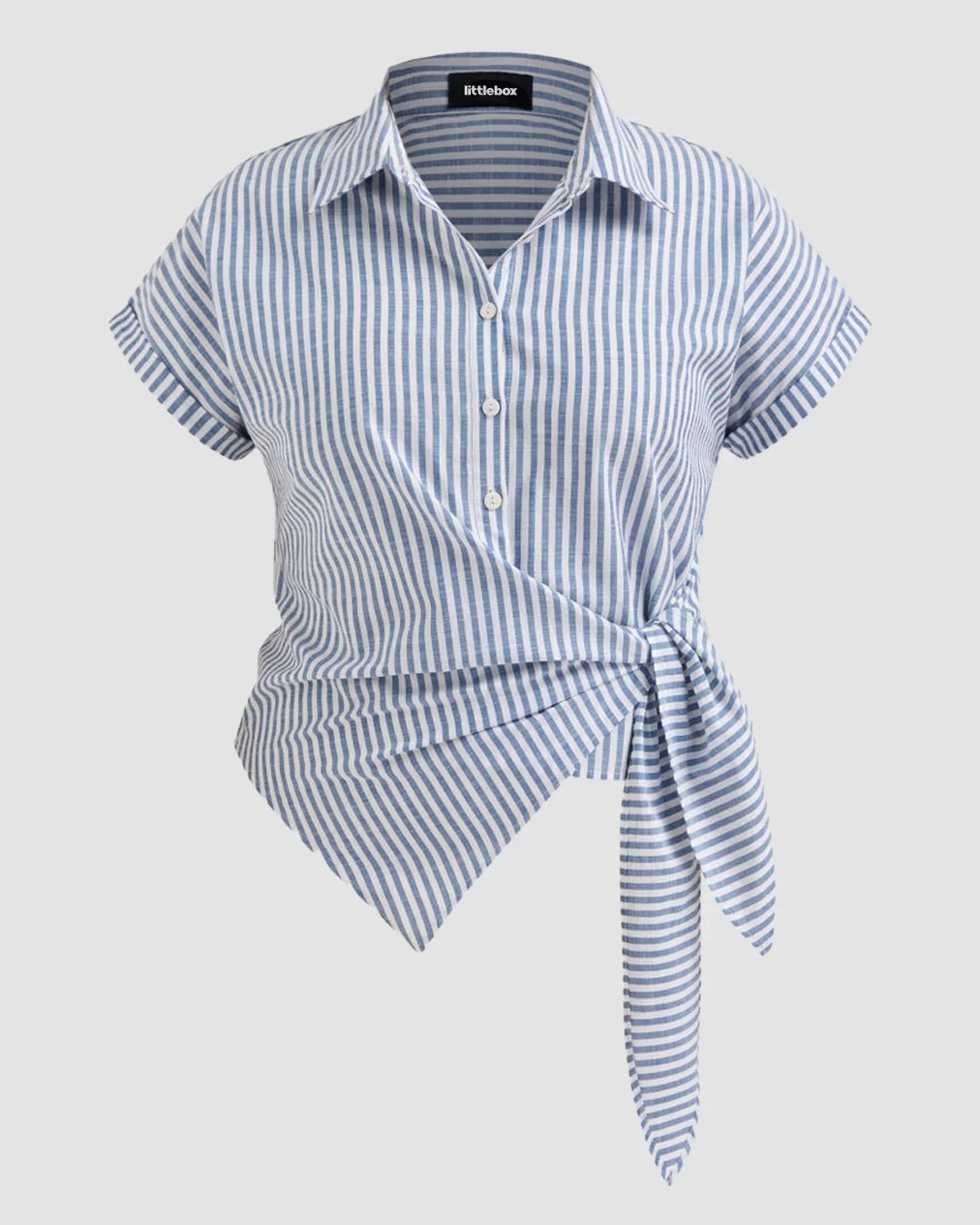 This short sleeve shirt curve & plus brings a fresh, summery vibe with its effortless mix of structure and flow. Designed with crisp blue-and-white stripes, it’s cut with a collared neckline, button-down front, and a side tie that adds a playful twist to a classic shirt silhouette. The light cotton blend makes this short sleeve shirt curve & plus breathable and perfect for warm days or casual layering.