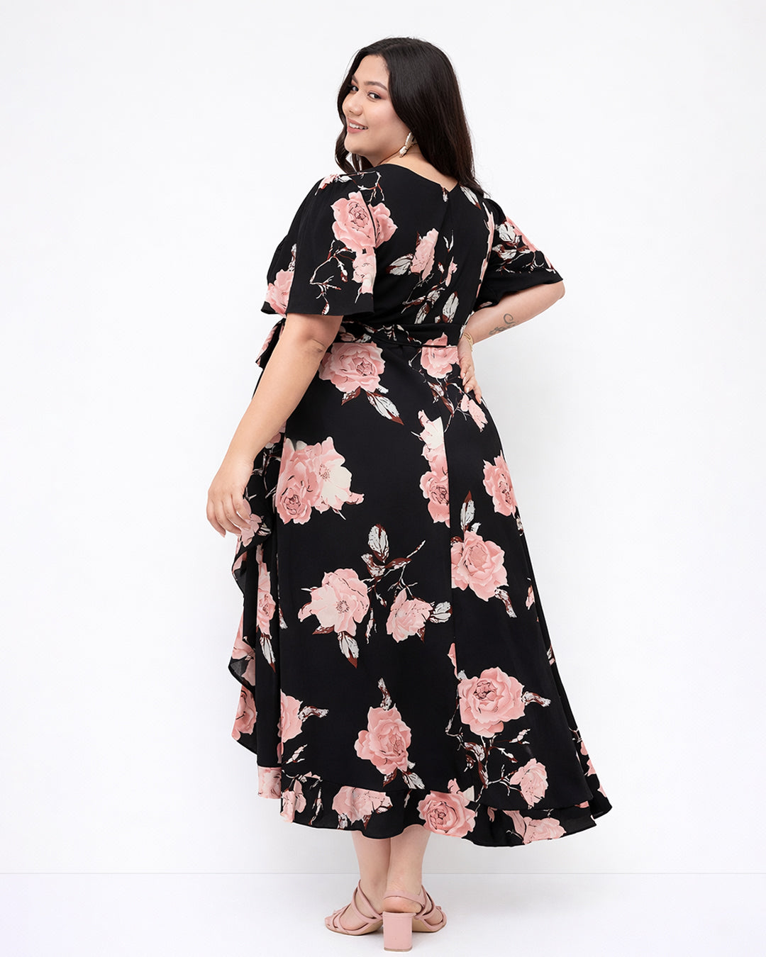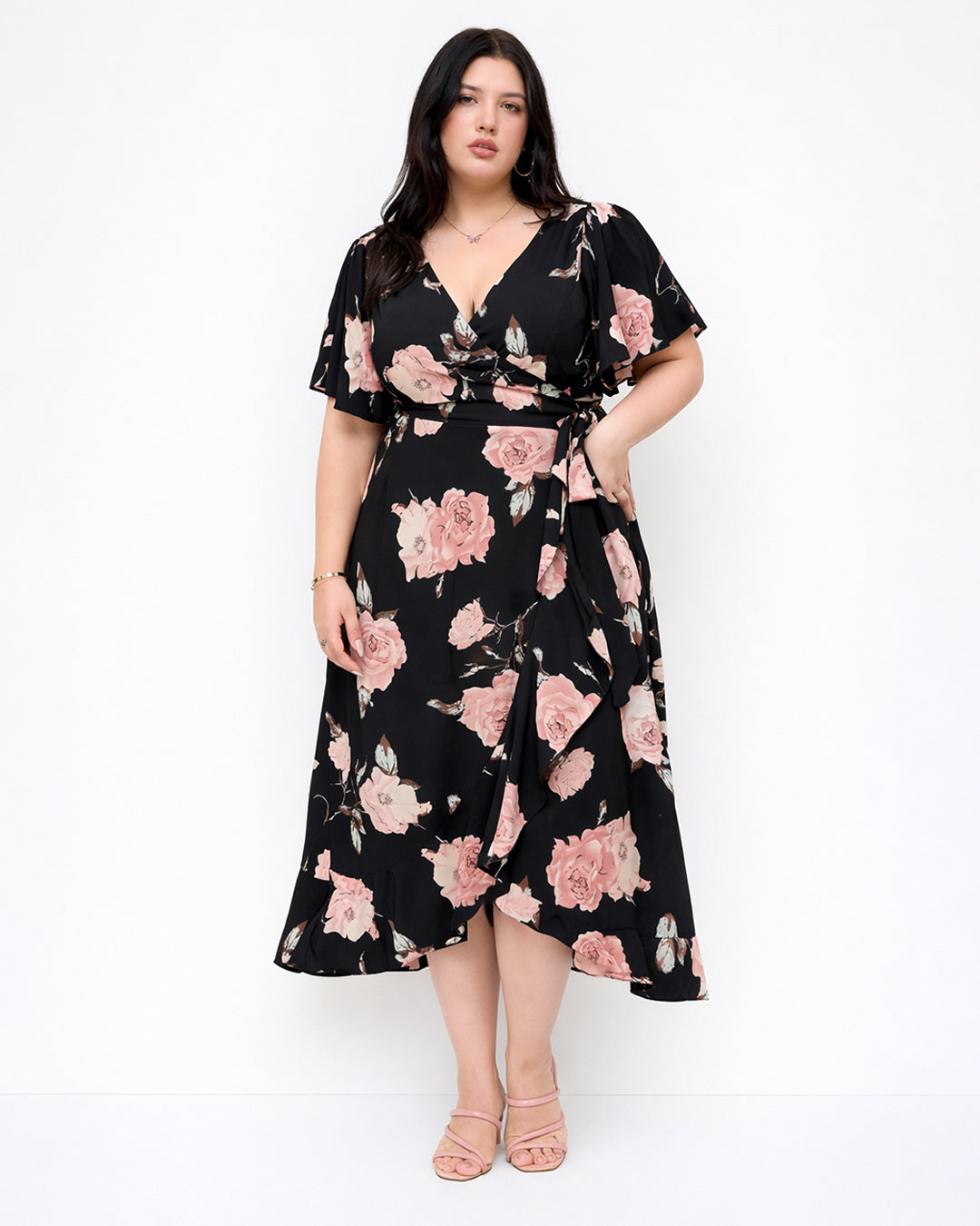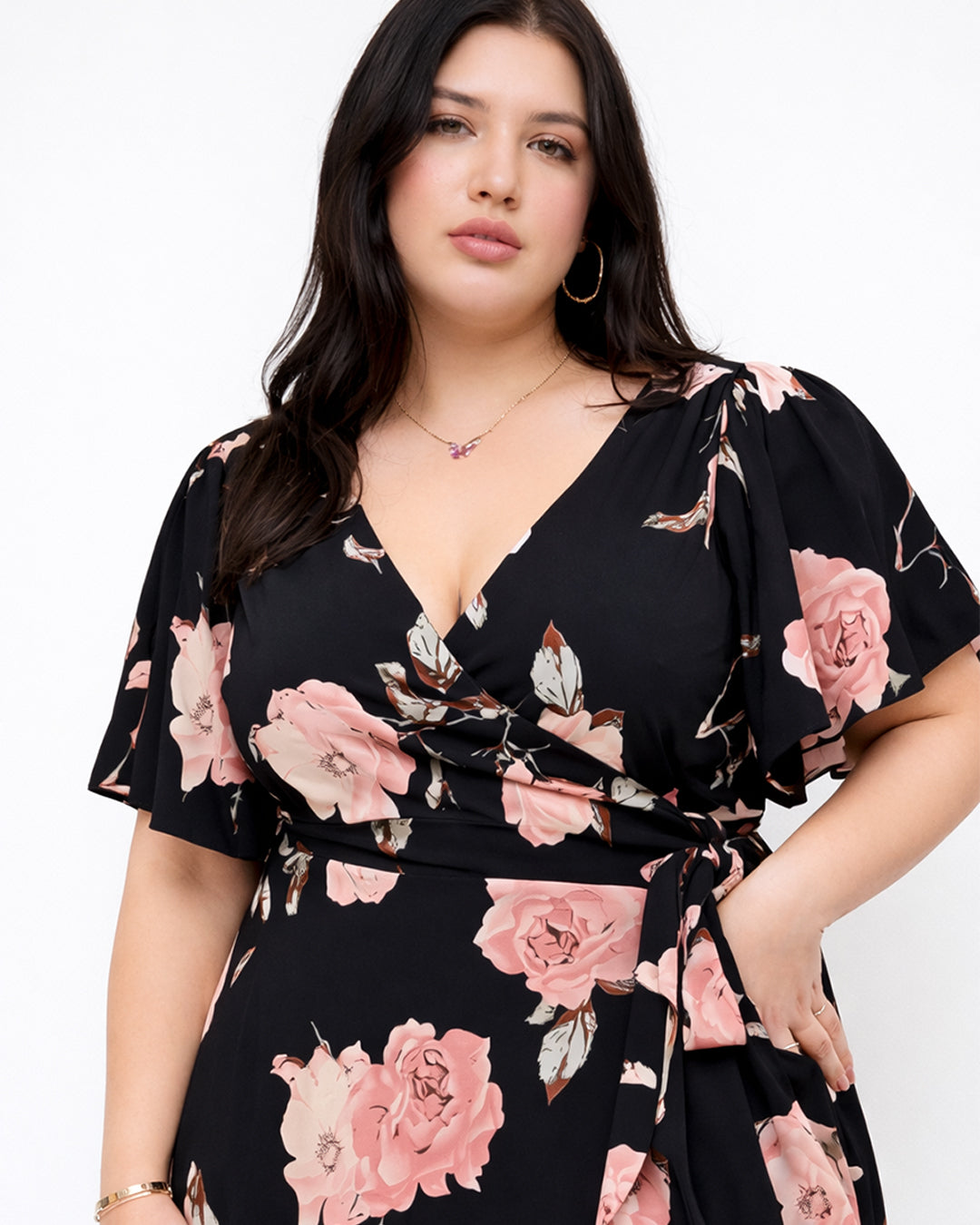 V Neck Flutter Short Sleeve Wrap Style Floral Dress Curve & Plus
