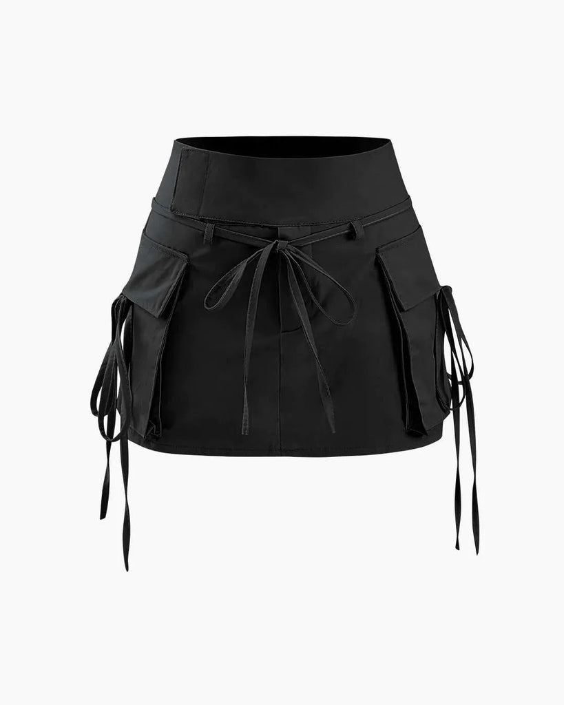 Black skirt featuring pockets and adjustable drawstrings for a customizable fit