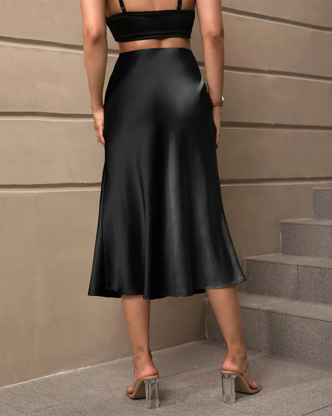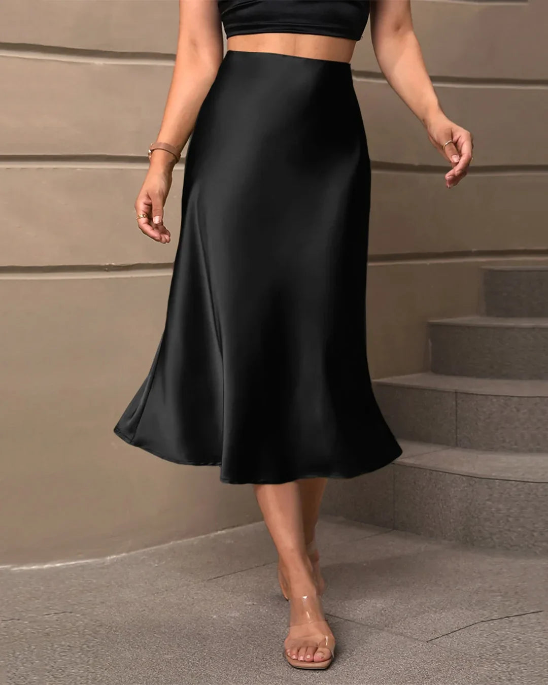 Satin Flared Midi Skirt in Black brings a smooth, flowy shape with a soft satin shine that feels polished and effortless. This Midi Skirt in Black features a clean waistband, a gentle flare, and a sleek finish that moves beautifully with every step. The fit sits comfortably at the waist and creates a minimal yet elevated silhouette. The black tone adds a classic touch and makes it easy to pair with basics or dressier tops for versatile styling.