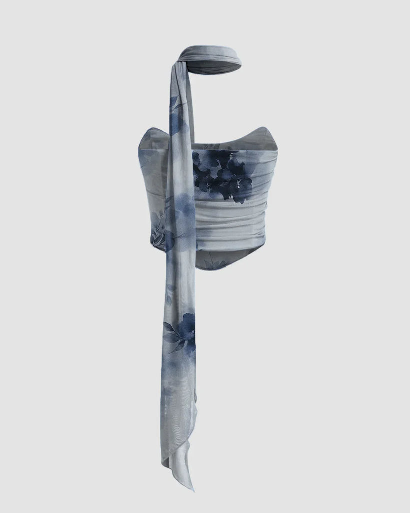 Blue Floral Strapless Wrap Front Tube Top