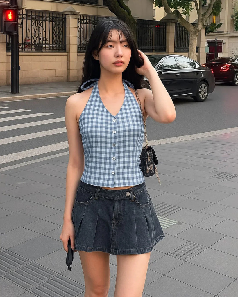 Blue Gingham Halter Neck Tie-Back Crop Top is a playful nod to retro charm with a modern fit. This blue crop top features a flattering halter neckline, button-down front, and an adjustable tie-back for a custom fit. The gingham checks add a timeless, preppy vibe that works for sunny outings or casual hangouts.