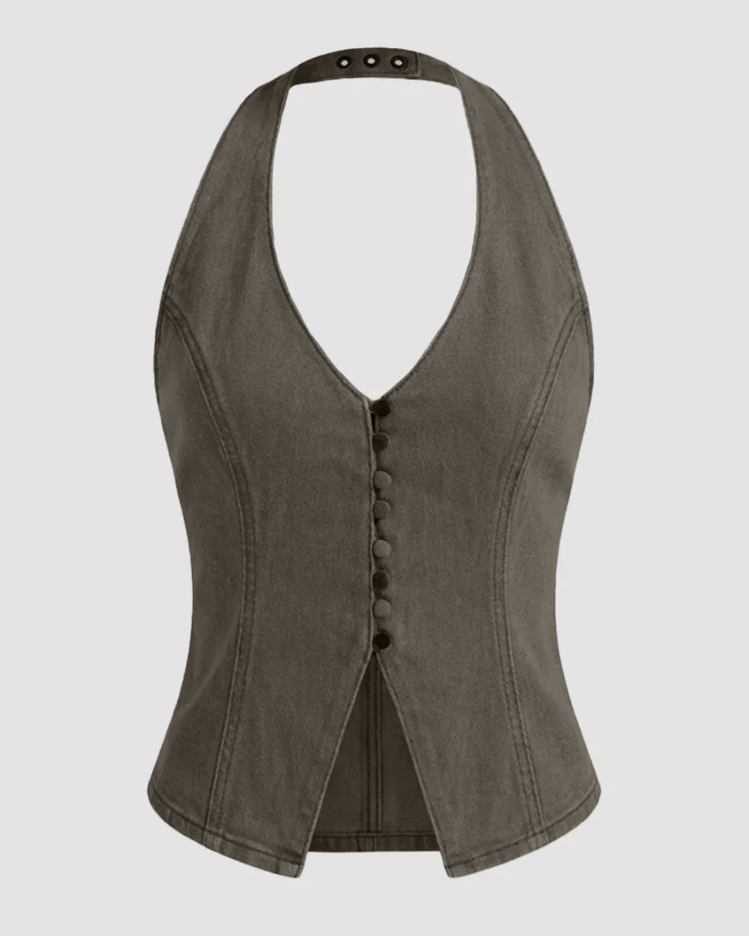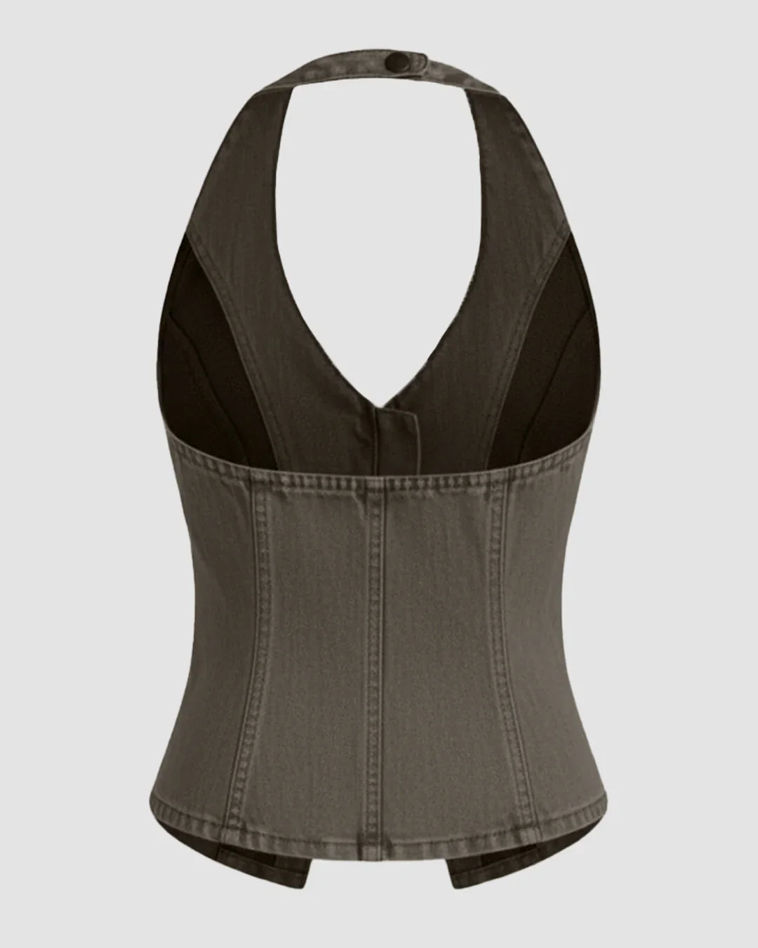 Denim Halter V-neck Split Front Top in Grey brings a clean, structured shape with a flattering neckline and fitted silhouette. The halter cut highlights the shoulders, while the split front adds a cool, modern touch. The smooth fabric mix keeps it comfortable and easy to wear. This V-neck Top in Grey has a sharp, minimal look that pairs well with denim, cargos or wide leg trousers. It feels stylish without trying too hard and keeps the overall vibe effortless.