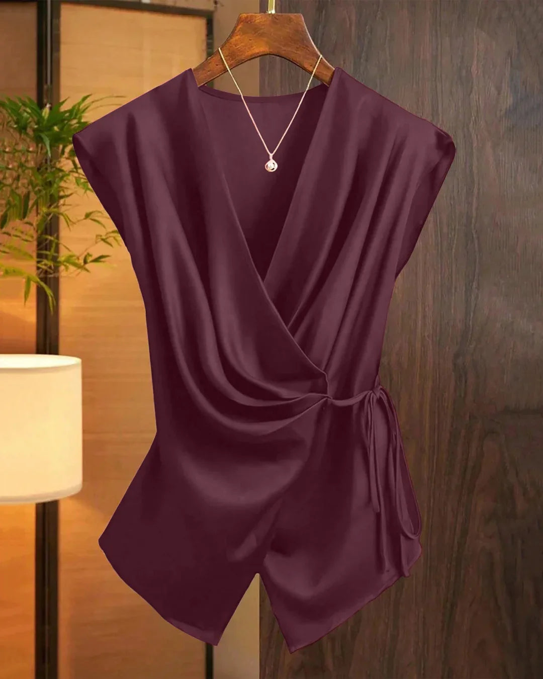 Maroon Solid Color Deep V-Neck Twist Knot Asymmetrical Top