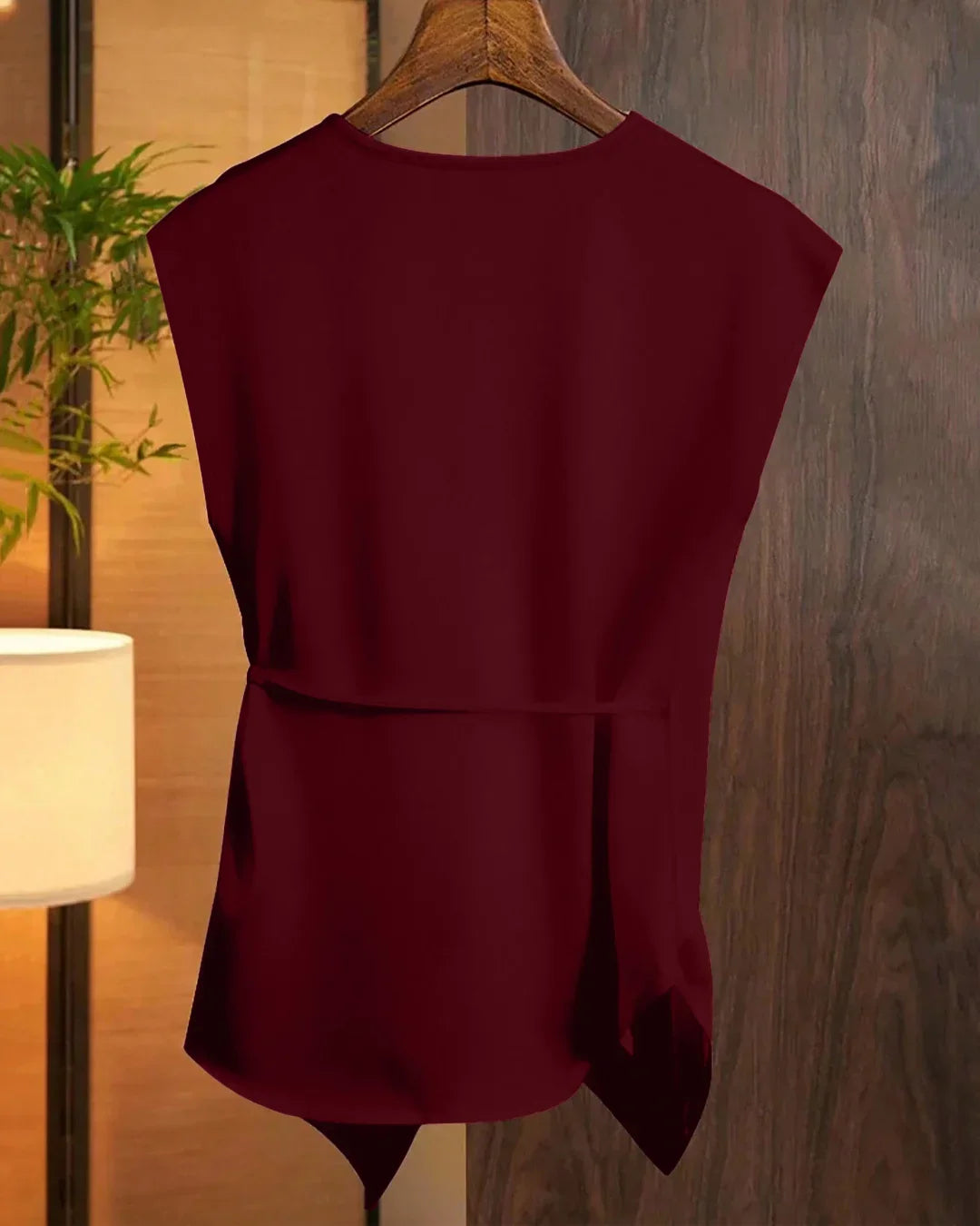 Red Solid Color Deep V-Neck Twist Knot Asymmetrical Top