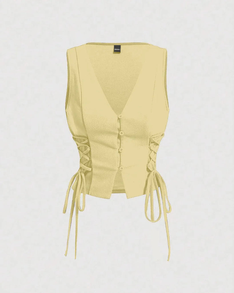 A Solid Color Cross Tie Strap Black Side Strap Crop Tank Top in GT Vanilla, featuring cross-tie straps and side lace-up details for a structured yet breathable fit.