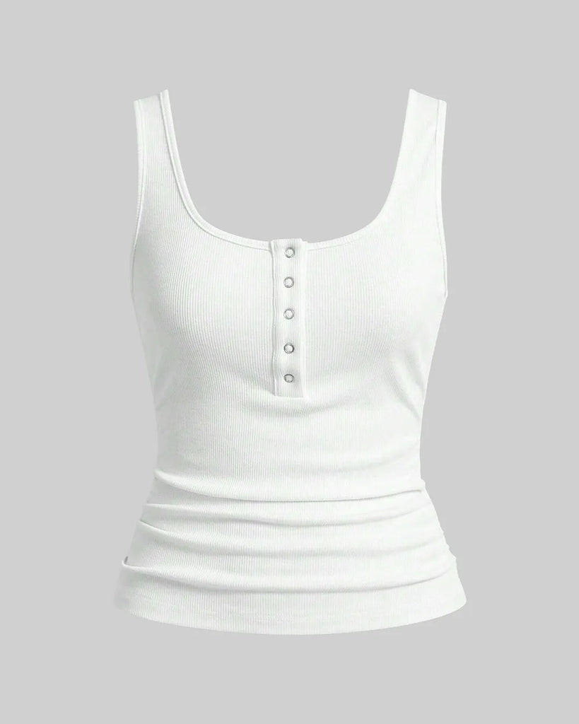 A white ribbed tank top with a scoop neckline and button-down front.