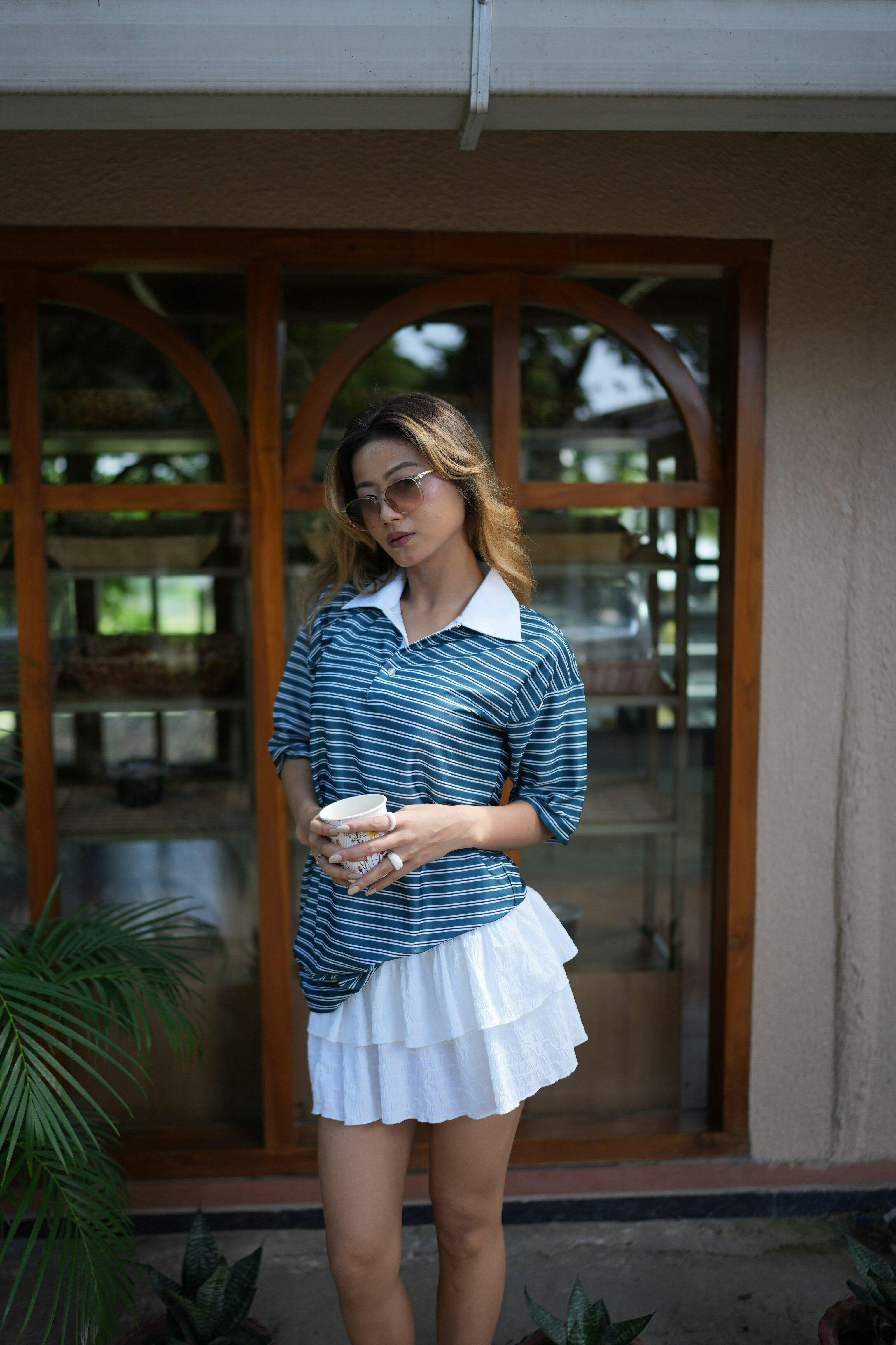 Striped Front Button Collar Neck Half Sleeve Top