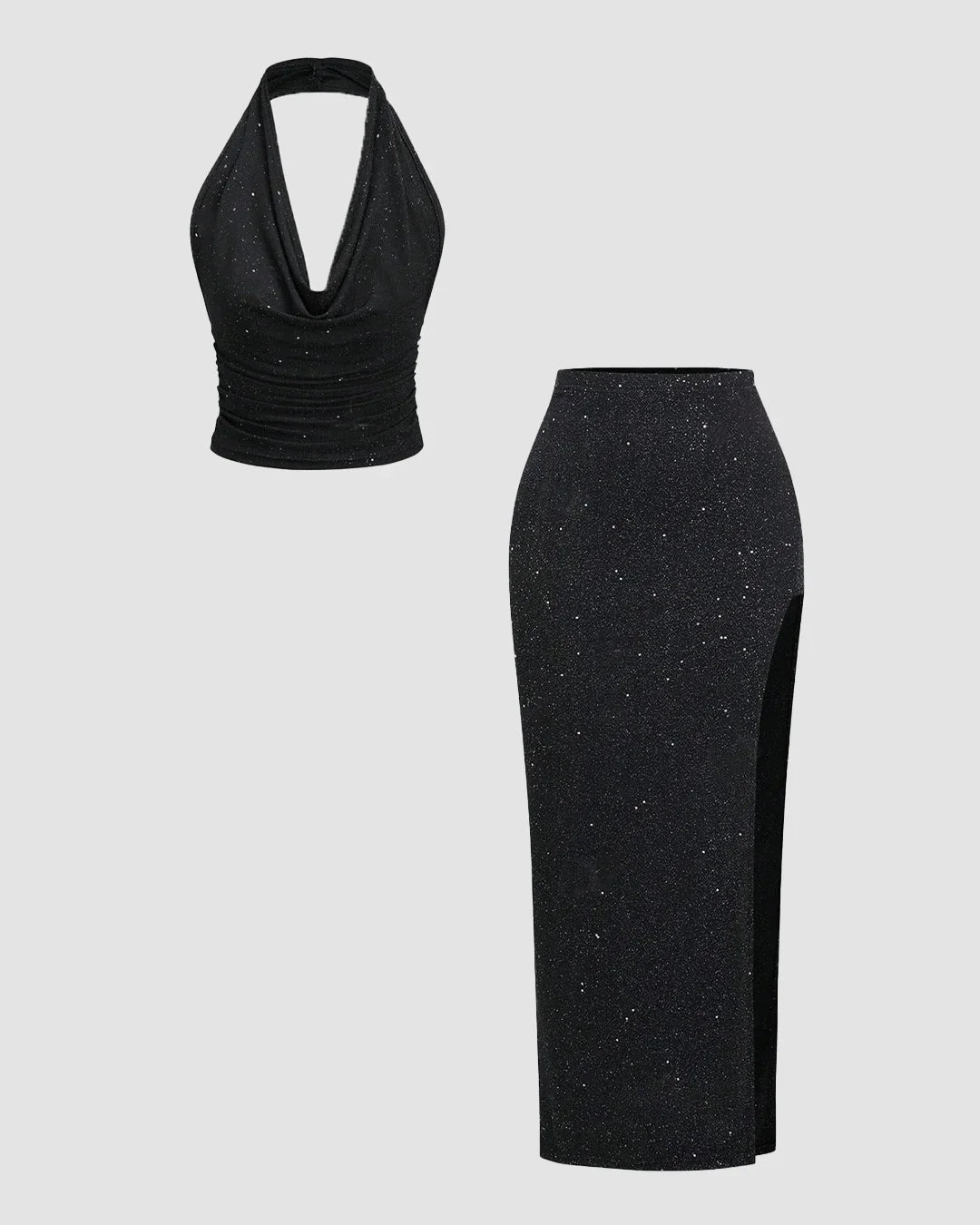 Black Glitter Halter Neck Backless Top & High-Slit Skirt Set