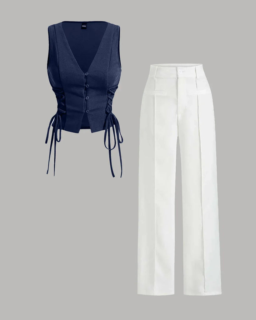 2-Piece Navy Corset Vest & Lace-Up Vest & White Wide-Leg Trouser Set