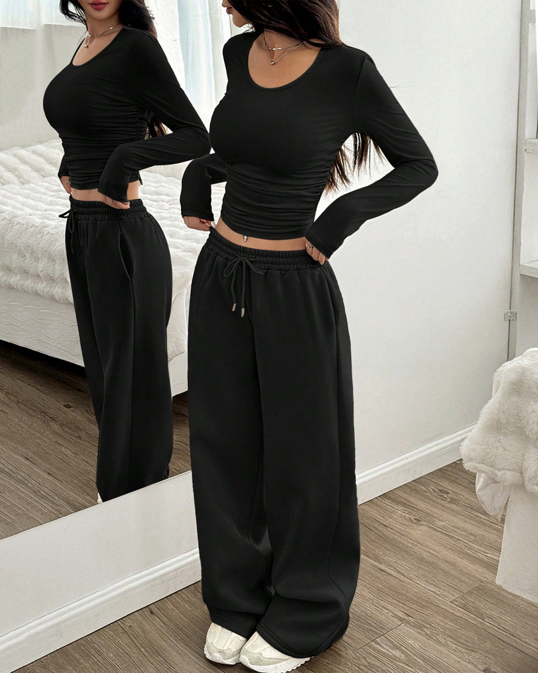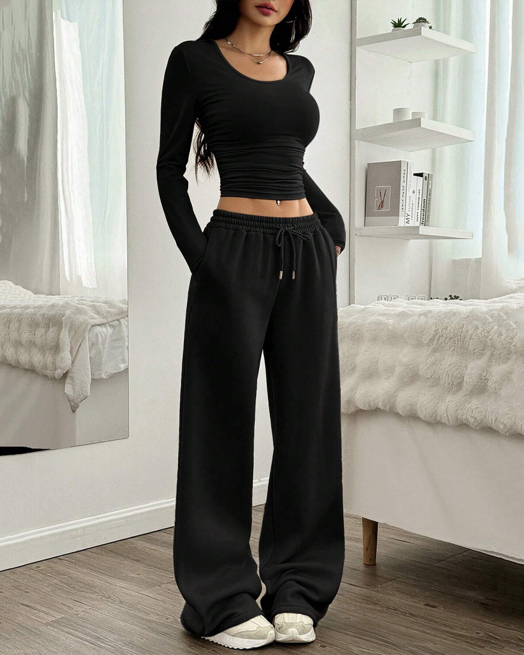 Black Round Neck Fitted Long Sleeve Top & Wide-Leg Pants Set is a clean, minimal look made for comfort with a sleek finish. The top comes with a smooth round neckline and a fitted shape that enhances the waist with gentle ruching. The wide-leg pants balance the silhouette with a relaxed, flowy fall that feels easy to move in. This Top & Wide-Leg Pants Set brings a simple yet put-together vibe that works well for casual days, quick outings, or just staying comfy indoors.